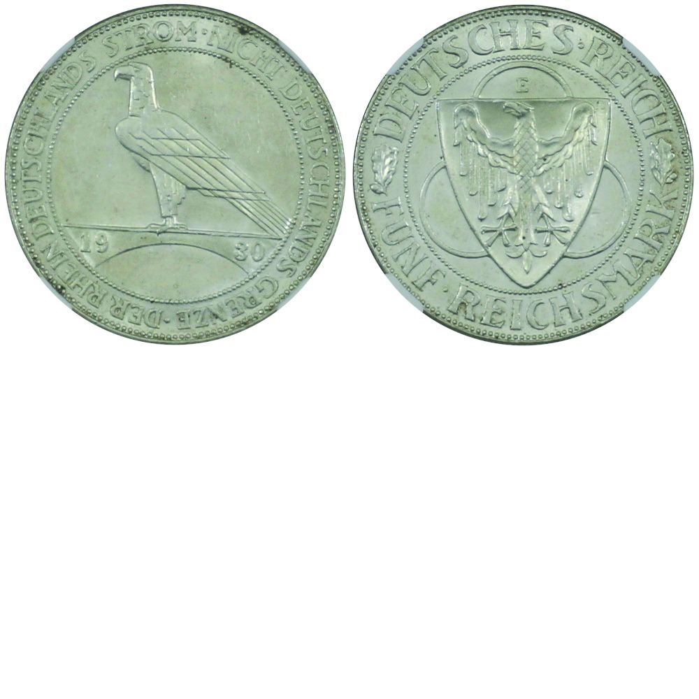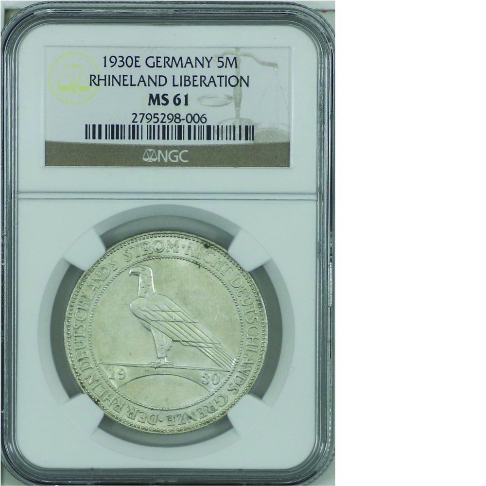 Germany, 1930E Silver 5 Mark Weimar Republic. Rhineland Liberation Commemorative. Coin is NGC certified MS-61. (KM# 71)