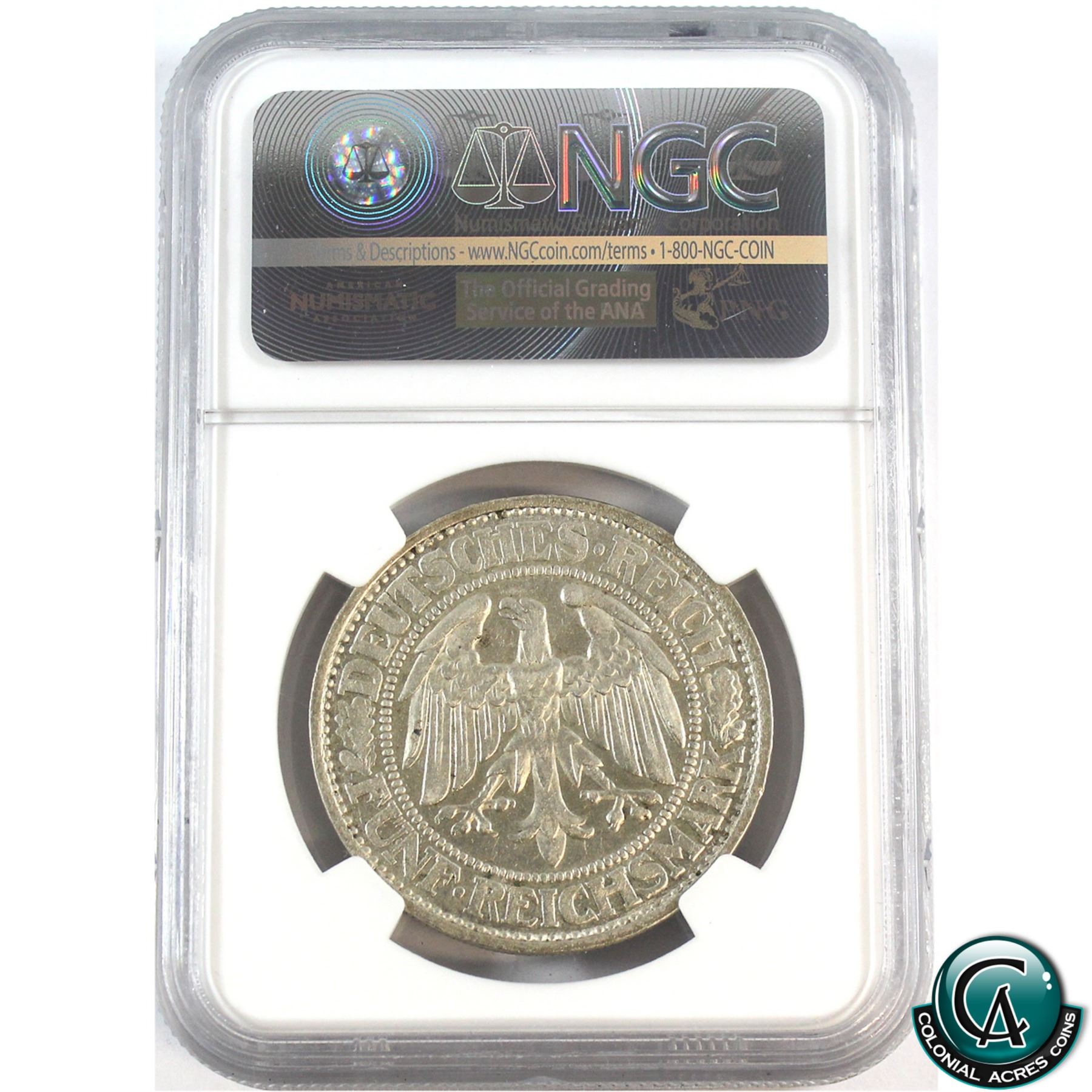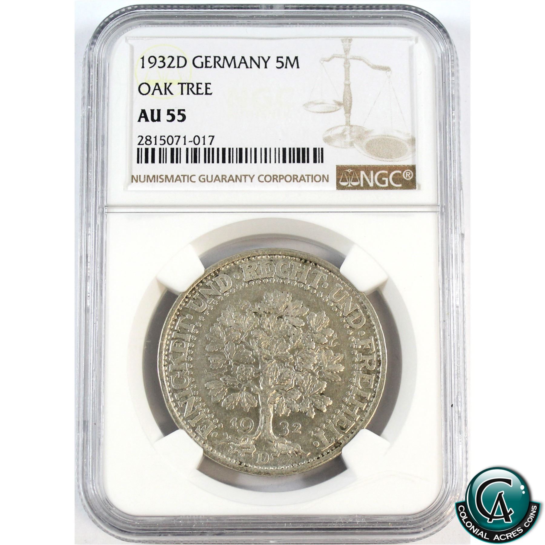Germany 1932D 5-Mark Oak Tree NGC Certified AU-55.
