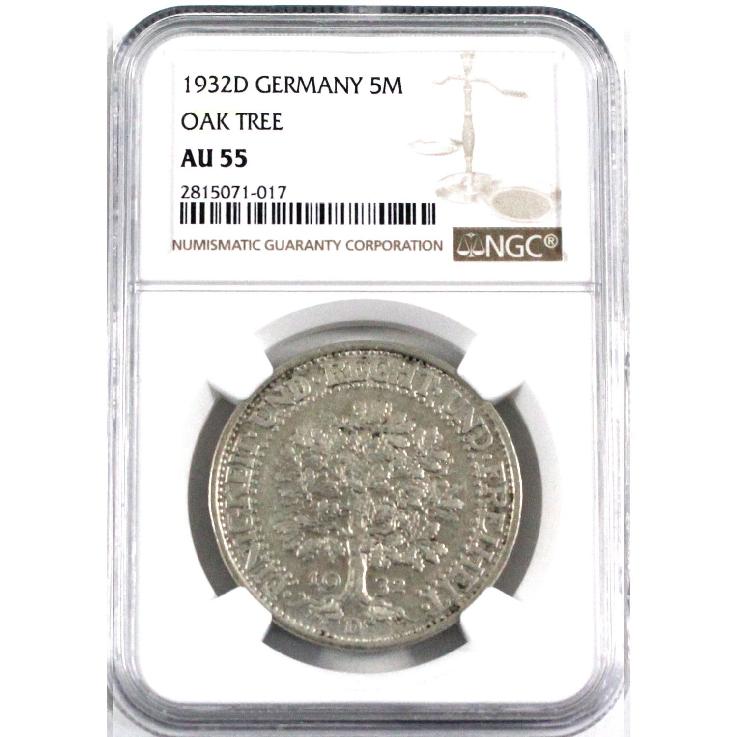 Germany 1932D Silver 5 Mark "Oak Tree" NGC Certified AU-55. A bright commemorative coin with an attractive design.