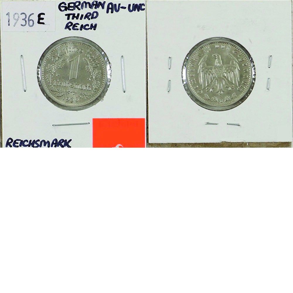 Germany; 1936E 1 Reichsmark from the Third Reich. Coin is in AU-UNC condition.