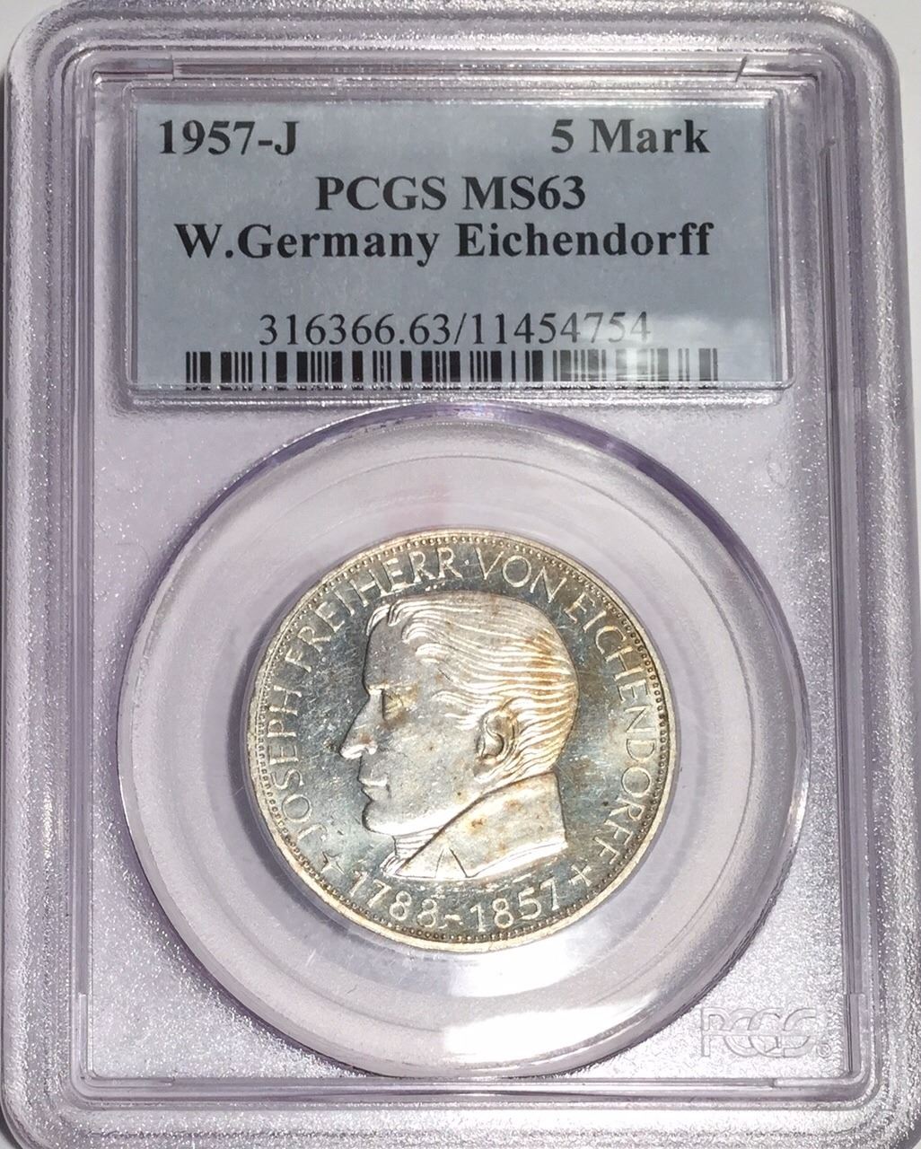 Germany 1957-J 5 Mark Eichendorff PCGS MS63