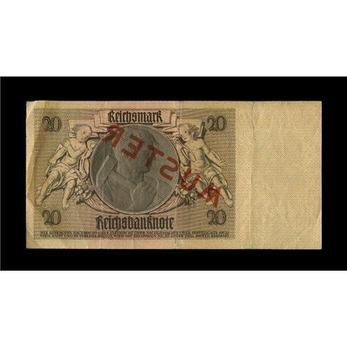 <B>Germany</B></I> 20 Reichsmark Specimen 1929 Pick 181a<BR>Serial number A00000000 and "Muster" (Specimen) is overprinted on this note. <B>Very Fine.</B></I><BR><BR><b>Shipping:</b> Coins & Currency (<a target="_blank" href="http://www.heritageauctions.com/common/shipping.php">view shipping information</a>)