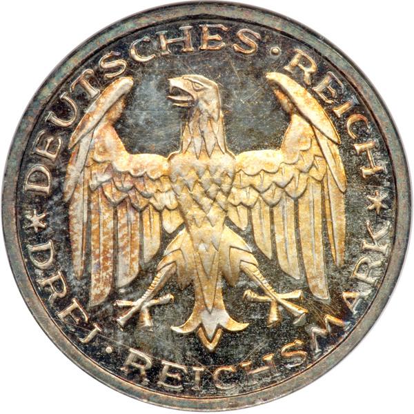 Germany. 3 Reichsmark, 1927-A. KM-53; J-330. For the 400th Anniversary - Philipps University in Marburg. Attractive iridescent toning. NGC graded Proof 65.