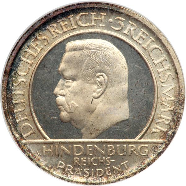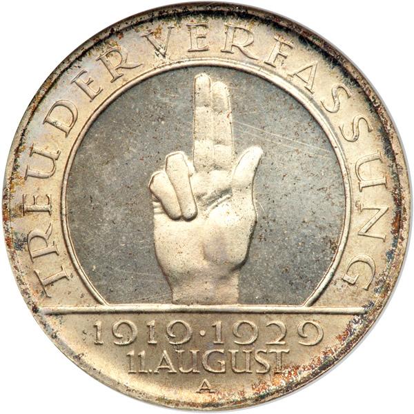 Germany. 3 Reichsmark, 1929-A. KM-63; J-340. On the 10th Anniversary - Weimar Constitution. Head of Hindenburg left. NGC graded Proof 65.