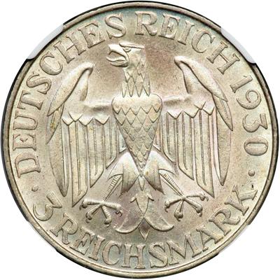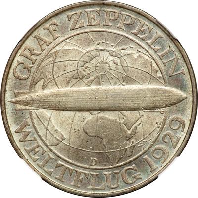 Germany. 3 Reichsmark, 1930-D. KM-67; J-342. Graf Zeppelin flight. NGC graded MS-64.