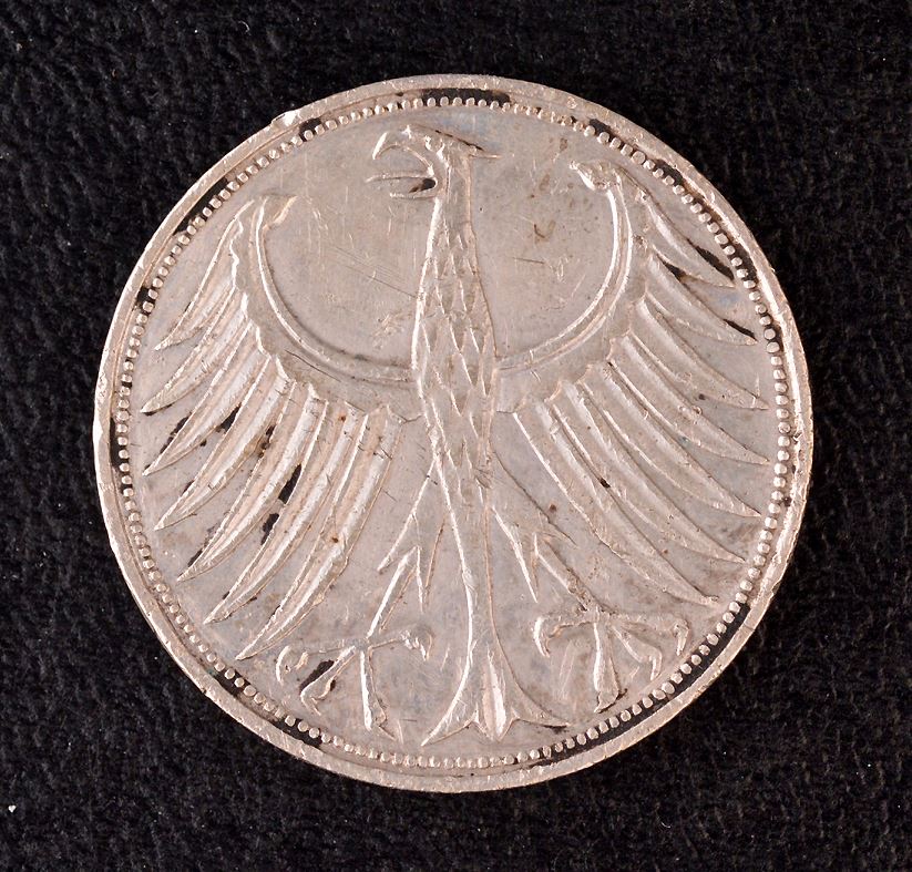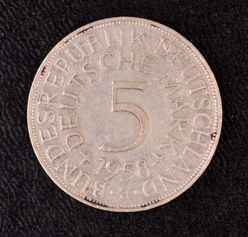 Germany, Federal Republic, 5 Mark, 1958J, KM#112.1, EF, cleaned. Rare, with only 60,000 struck.