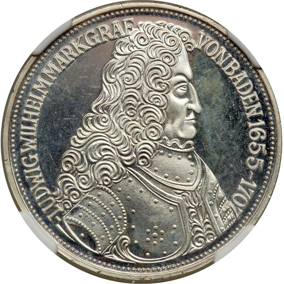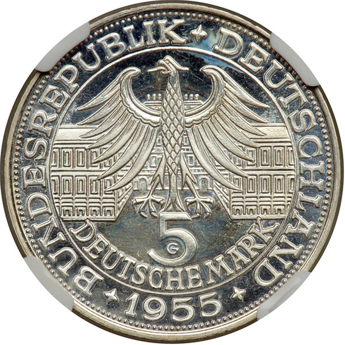 Germany. 5 Marks, 1955-G. KM-115; J-390. For the 300th Anniversary - Birth of Ludwig von Baden. Proof mintage 2,000 pieces. NGC graded Proof 64 Cameo.