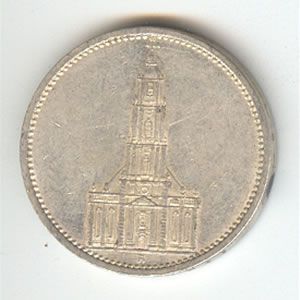 Germany 5 reichsmark, 1934-1935, Potsdam Church (KM83) **|**|** This is a 5 reichsmark piece from the German Third Reich (KM83), minted between 1934 and 1935, featuring the Potsdam church. Very Fine to Extra Fine condition, .4016 oz. silver. ; MSRP: $975
