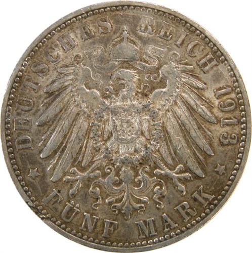 German States - Wurtenberg 5Marks 1913F, EF. Light toning