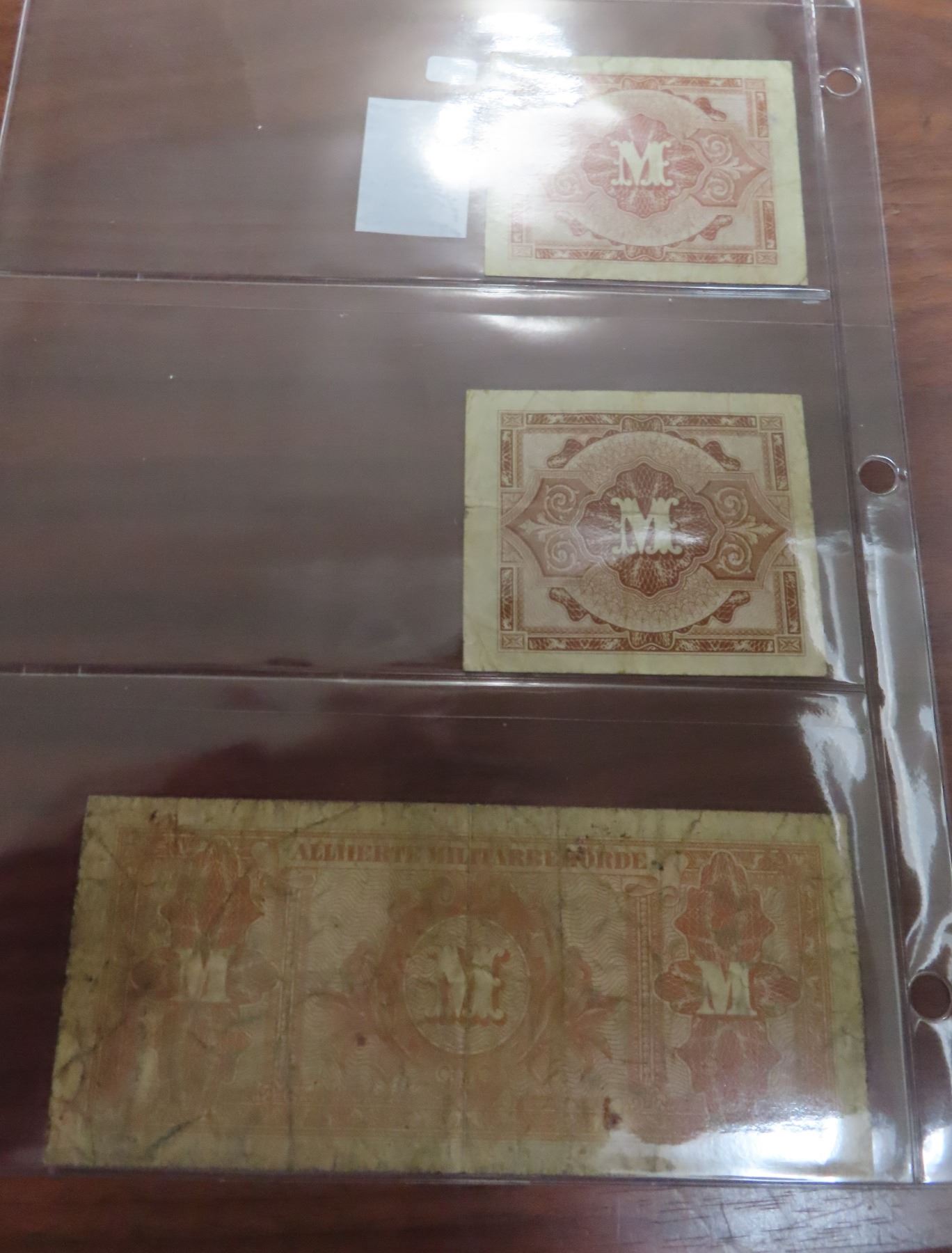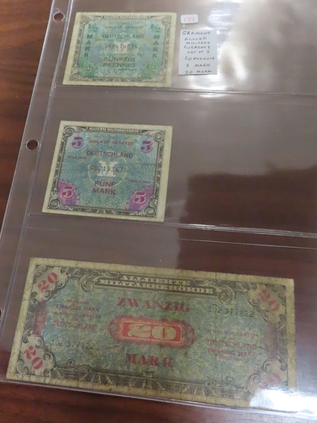 Germany – Allied Military Currency. Lot of 3 notes dated 1944 for 50 pfennig, 5 Mark & 20 Mark. VG or better.