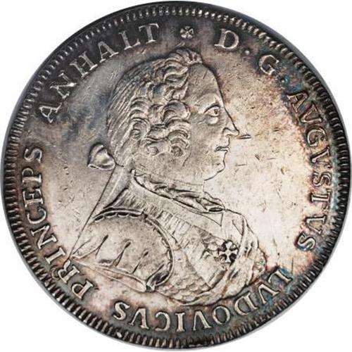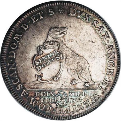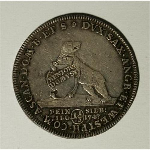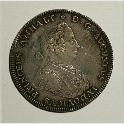 <B>Anhalt-Kothen. August Ludwig I 1/3 Reichstaler 1747,</B></I> KM26, Davenport 1909, toned AU, virtually no wear evident, the surfaces display some noticeable small contact marks. Very scarce type and a highly unusual denomination.<BR><BR><b>Shipping:</b> Coins & Currency (<a target="_blank" href="http://www.heritageauctions.com/common/shipping.php">view shipping information</a>)