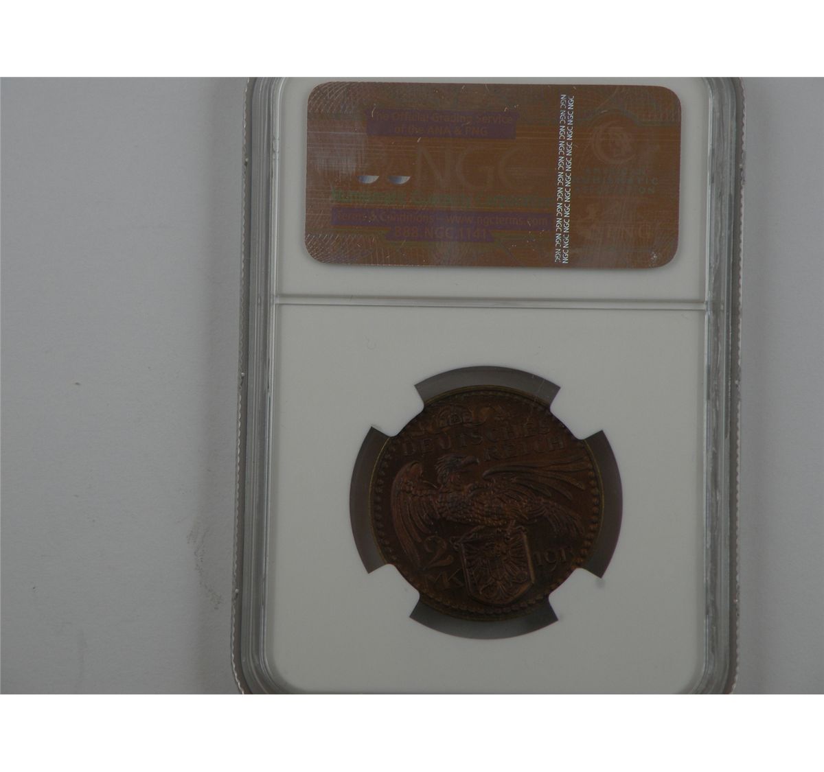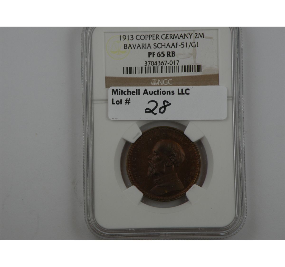 Germany, Bavaria. 1913 2Mark Pattern struck in copper. Schaaf-51/G1. NGC PF65RB The first in an interesting run of scarce German patterns designed by Karl Goetz. Sharp, evenly faded and reflective. Est.$200
