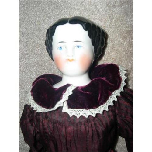 This is a Germany made china head from the 1860's called a high brow.She has the white center part and vertical rows of curls down the sides and in the back coming down from a smooth top. The head is 3 1/2" tall. She has the red nostril dots, line through lips, and above the blue eyes. She has nice cheek coloring. Her clothing doesn't allow me to see the entire shoulder plate but I have pulled it down as far as I can and the head has sloped shouders and doesn't appear to have any damage. She had 2 sew holes that I can feel. I think the body is new. The arms and legs appear to be old. The legs have a number up top but I can't make it out. The boots are painted orange with a green ribbon and bow at the top. Someone who knows more about china than me will know for sure if they are old. The hands are old for sure. She has on pantaloons and a half slip. They are older material than the dress. The dress has worn thin at the back where the shoulder plate has rubbed. The sleeves are made in the appropriate fashion of the day. They have puffs at the top and then straigt and fitted to the wrist. If you can love her, please bid. She comes from a smoke free environment. Buyer to pay $20 for U.S. shipping, insurance, and handling. Thanks for viewing.