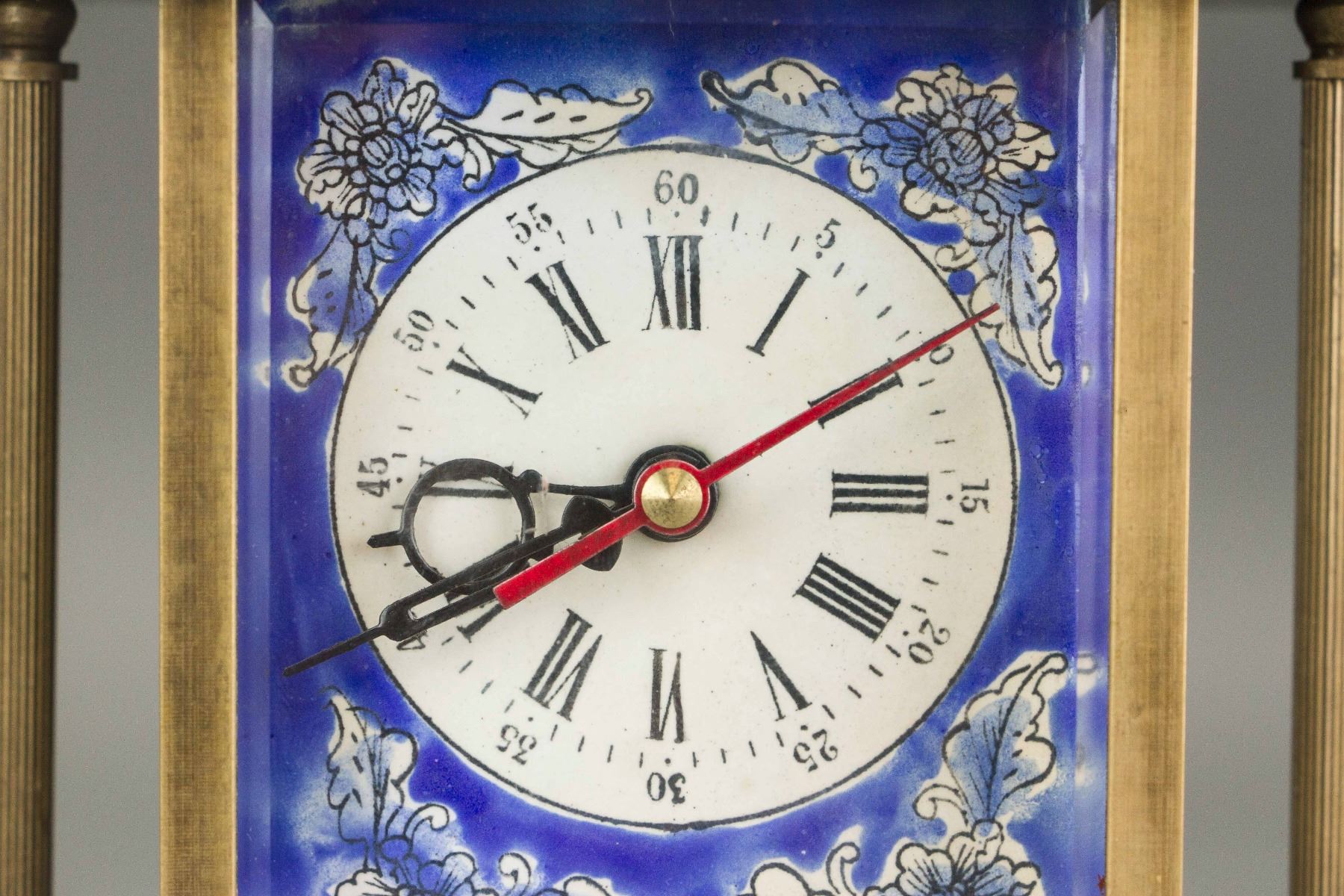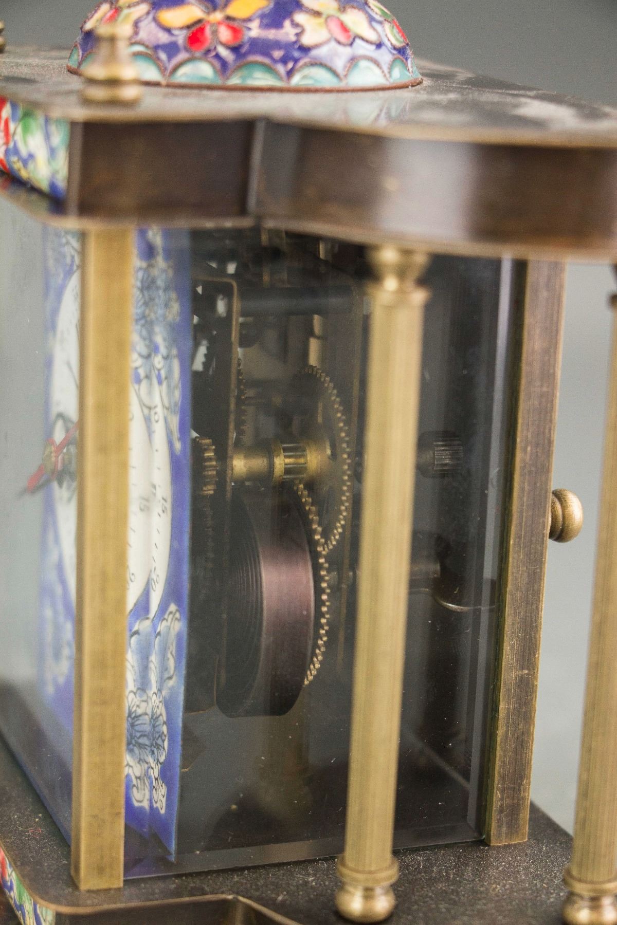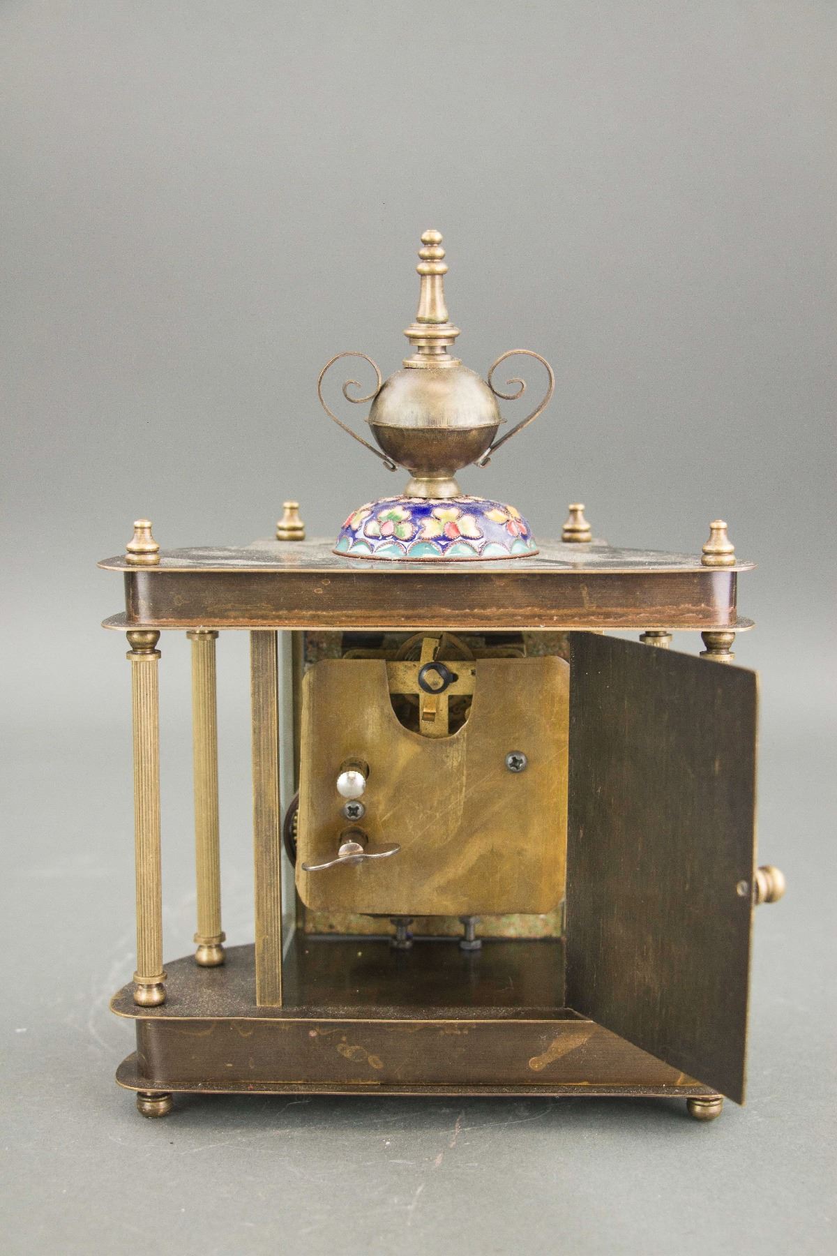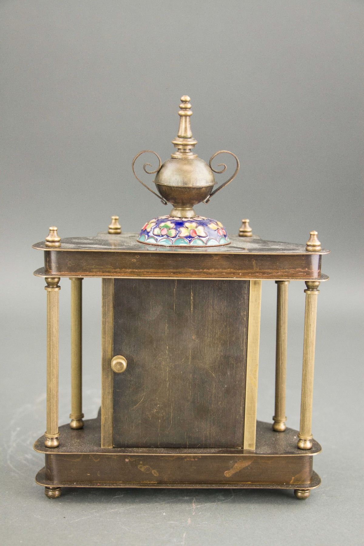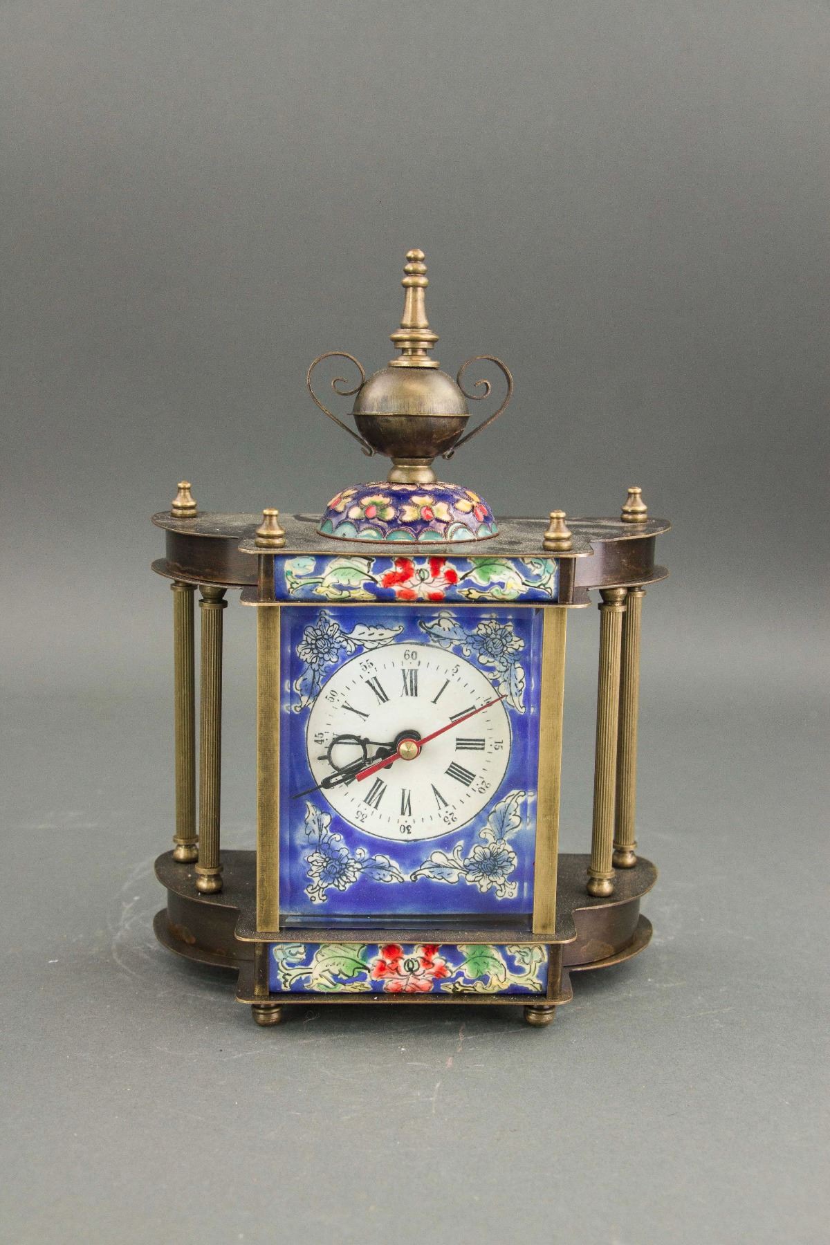 Germany cloisonne table clock; of Roman style building form, decorated with cloisonne plague; "Germany 1883" mark on base; in working condition; H: 20 cm, W: 16 cm, 773 grams