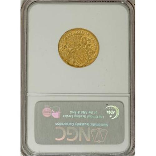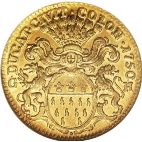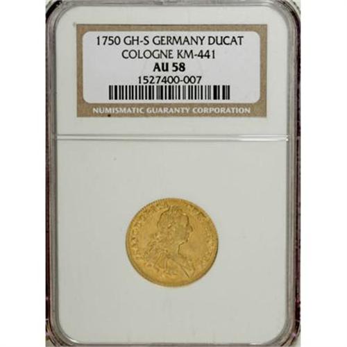 <B>Cologne - Free City. Francis I gold Ducat 1750-GH-S,</B></I> KM441, AU58 NGC, struck in the name of Francis I for Clemens August von Bayern. A choice lustrous example with bold features and flashy surfaces. Very scarce type and grade.<BR><BR><b>Shipping:</b> Coins & Currency (<a target="_blank" href="http://www.heritageauctions.com/common/shipping.php">view shipping information</a>)