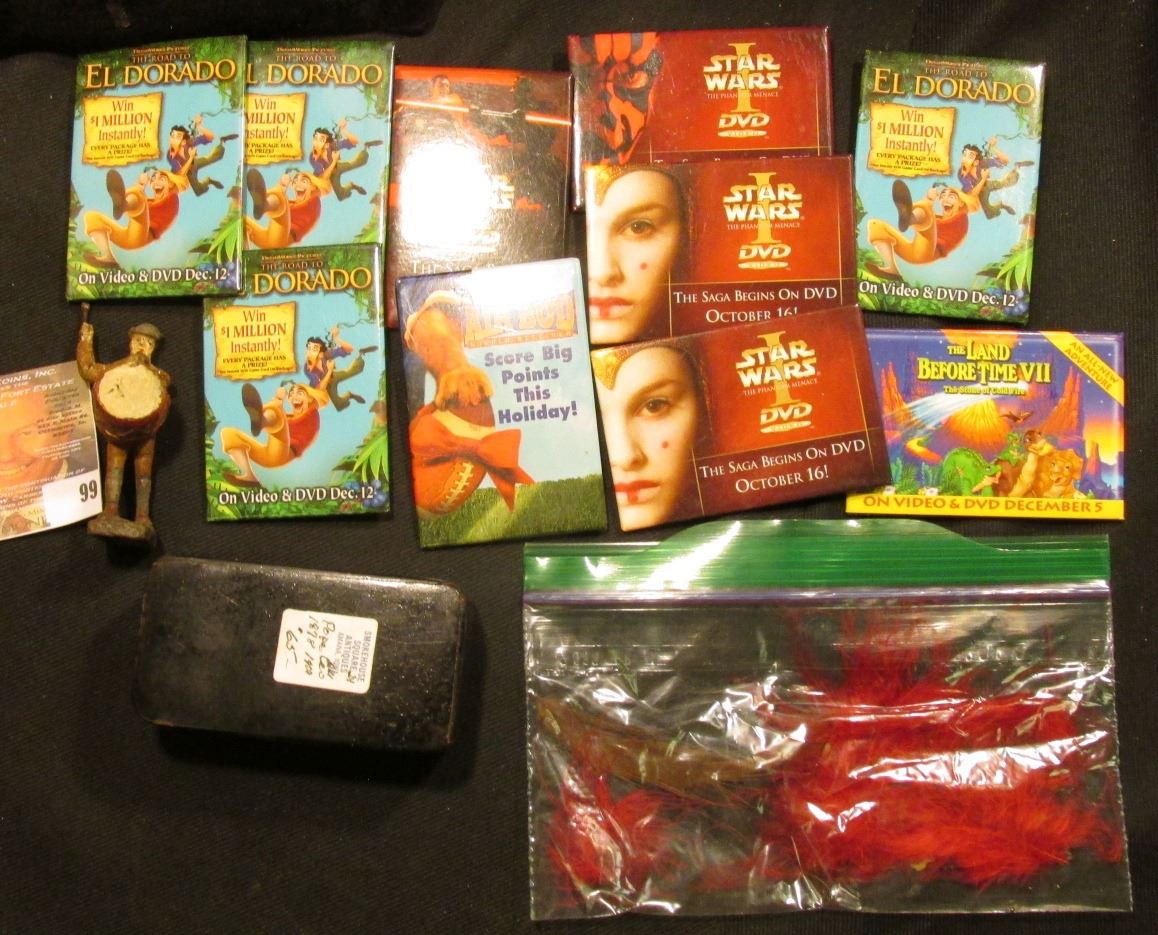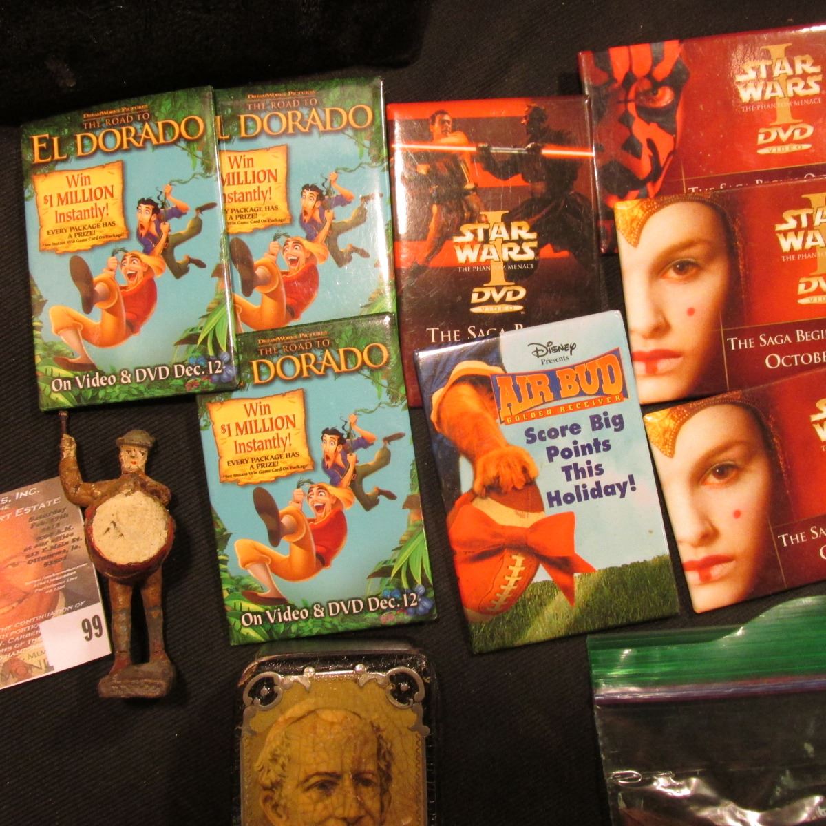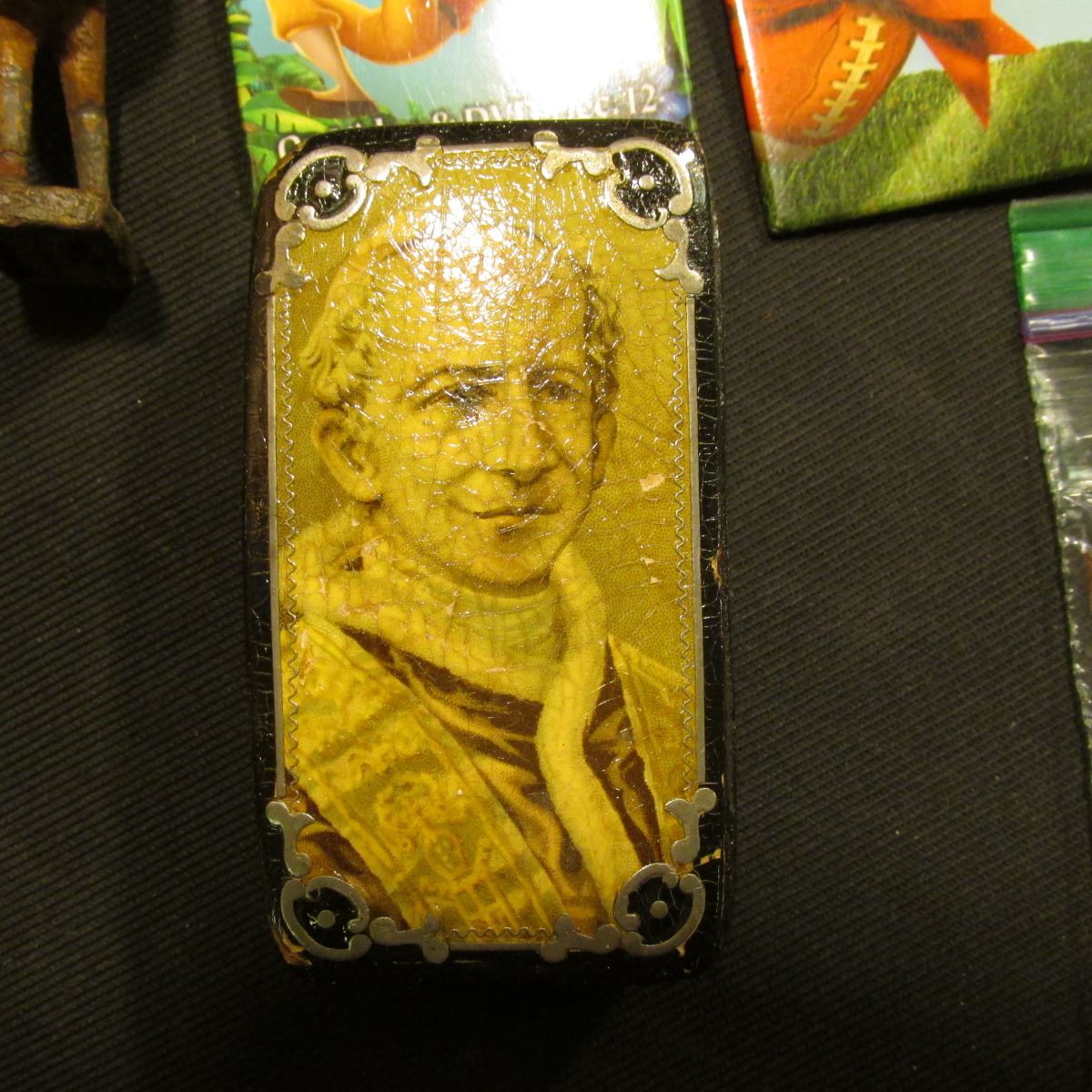 Germany "Drummer" Figurine 2 1/2"; Wooden Snuff Box depicting Pope Leo (a real sleeper in this group that 'Doc' had priced $65); & (10) various Walt Disney Movie Pinbacks.