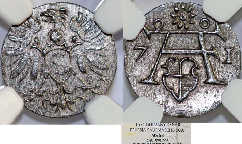 Obv: Arms in center, shield with "S" on a chest (symbolizing initial of Polish king Sigismund II to whom duke Albrecht was a Vassal ). Rev: Initial with shield under, dividing partial date.