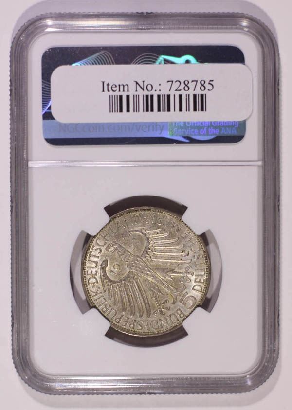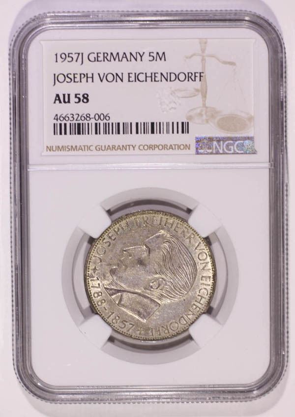 Germany: Federal Republic, 1957J, 5 Marks. Joseph Von Eichendorff. NGC graded AU-58.