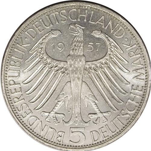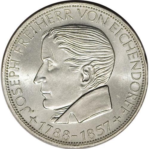 <B>Federal Republic 5 Mark 1957J, </B></I>KM117, choice brilliant UNC, two small contact marks, one on the obverse rim at 3 o'clock. Eichendorff commemorative.<BR><BR><b>Shipping:</b> Coins & Currency (<a target="_blank" href="http://www.heritageauctions.com/common/shipping.php">view shipping information</a>)