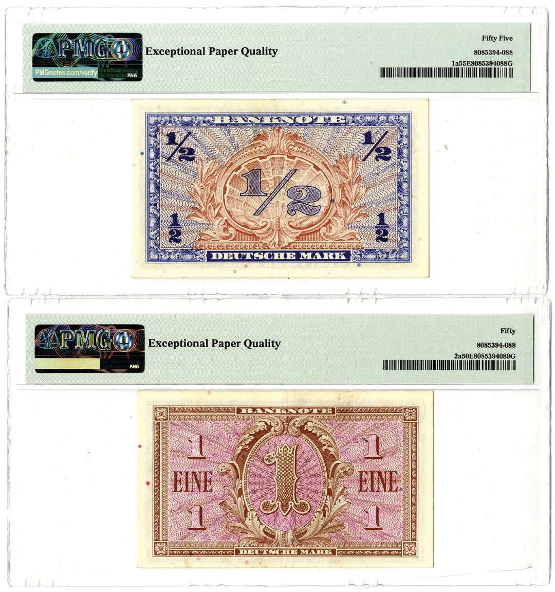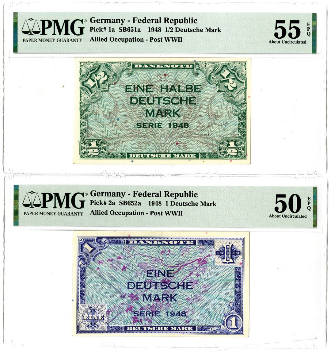 Germany. 1948. 2 pieces, Allied Occupation - Post WWII: 1 Deutsche Mark, P-2a SB652a, Issued banknote, Blue and teal, PMG graded About Uncirculated 50 EPQ; 1/2 Deutsche Mark, P-1a SB651a, Issued banknote, Green, PMG graded About Uncirculated 55 EPQ. (2)