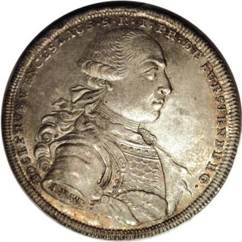 <B>Furstenberg-Stuhlingen. Josef Wenzel Taler 1767-ARW,</B></I> KM16, Davenport 2270, fabulous AU-UNC, aged gray and gold patina, light porosity on the reverse. First type with intricate breast plate. Rare type and grade. Sold with an original dealer's tag from the Munzhandlung Basel, marked $6!<BR><BR><b>Shipping:</b> Coins & Currency (<a target="_blank" href="http://www.heritageauctions.com/common/shipping.php">view shipping information</a>)