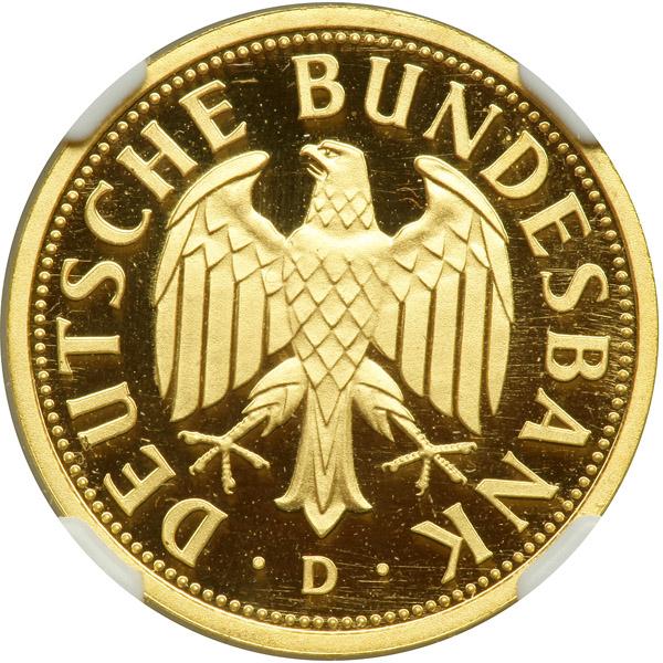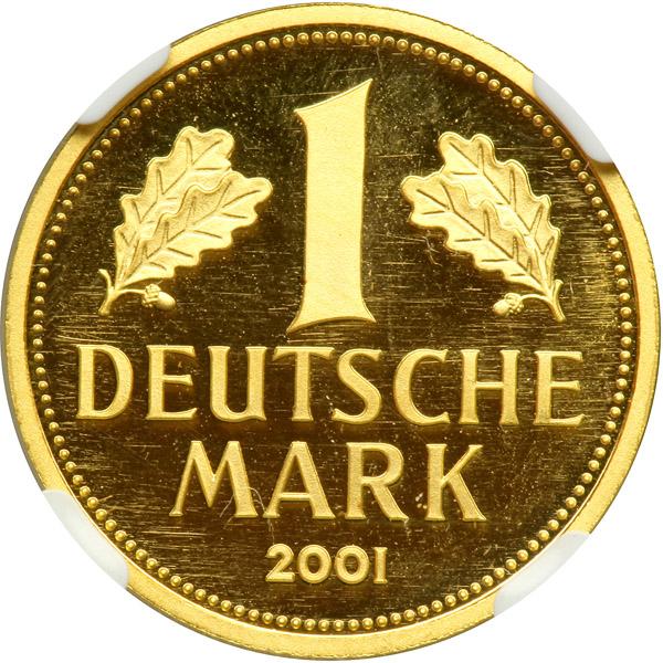 Germany. Gold 1 Mark, 2001-D. KM-203. Weight 0.3806 ounce. Imperial eagle. Reverse: Retirement of the Mark Currency. NGC graded Proof 67 Ultra Cameo.