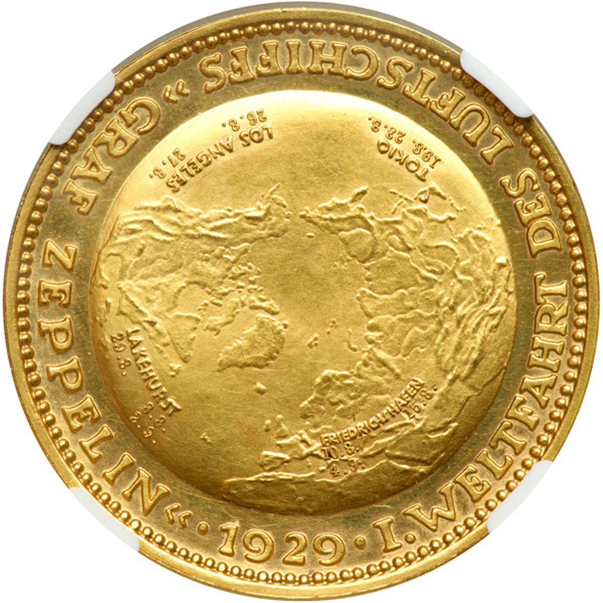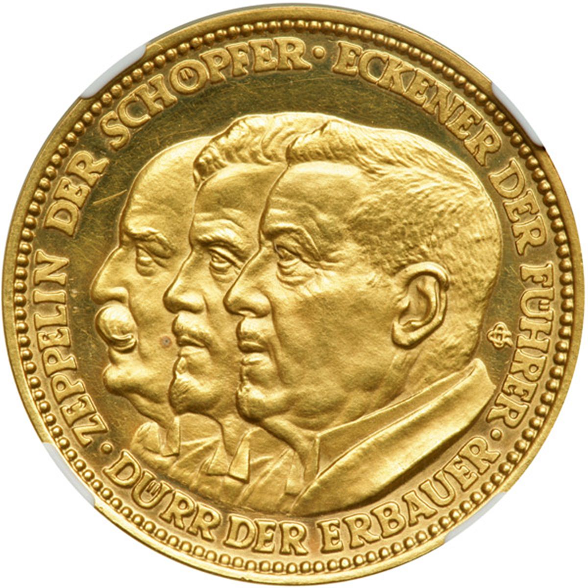 Germany. Gold Medal, 1929. Kaiser-511.2. 22.8 grams. 36.2 mm. Graf Zeppelin World Tour. Schopper, Eckener and Erbauer busts left. Reverse: Map. NGC graded Proof 62 Cameo.