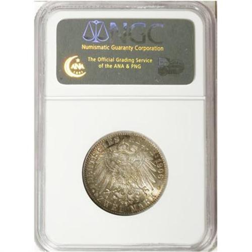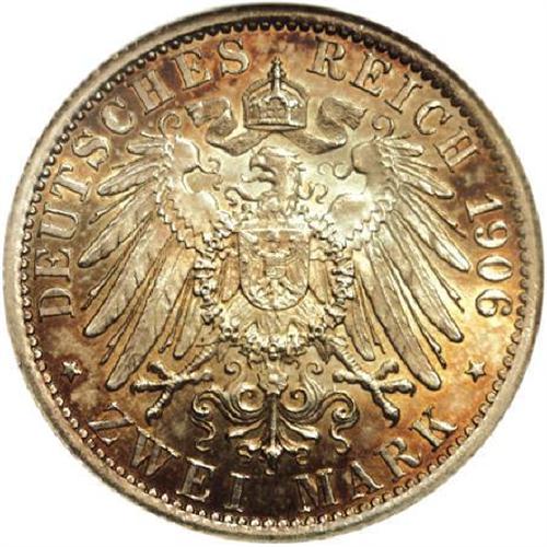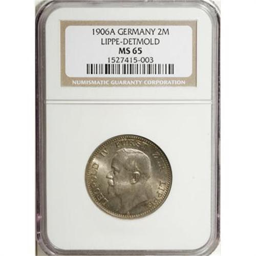 <B>Lippe-Detmold. Leopold IV 2 Mark 1906A,</B></I> KM270, MS65 NGC, light champagne toning over fully lustrous surfaces, a very nice example of this scarce one-year type.<BR><BR><b>Shipping:</b> Coins & Currency (<a target="_blank" href="http://www.heritageauctions.com/common/shipping.php">view shipping information</a>)