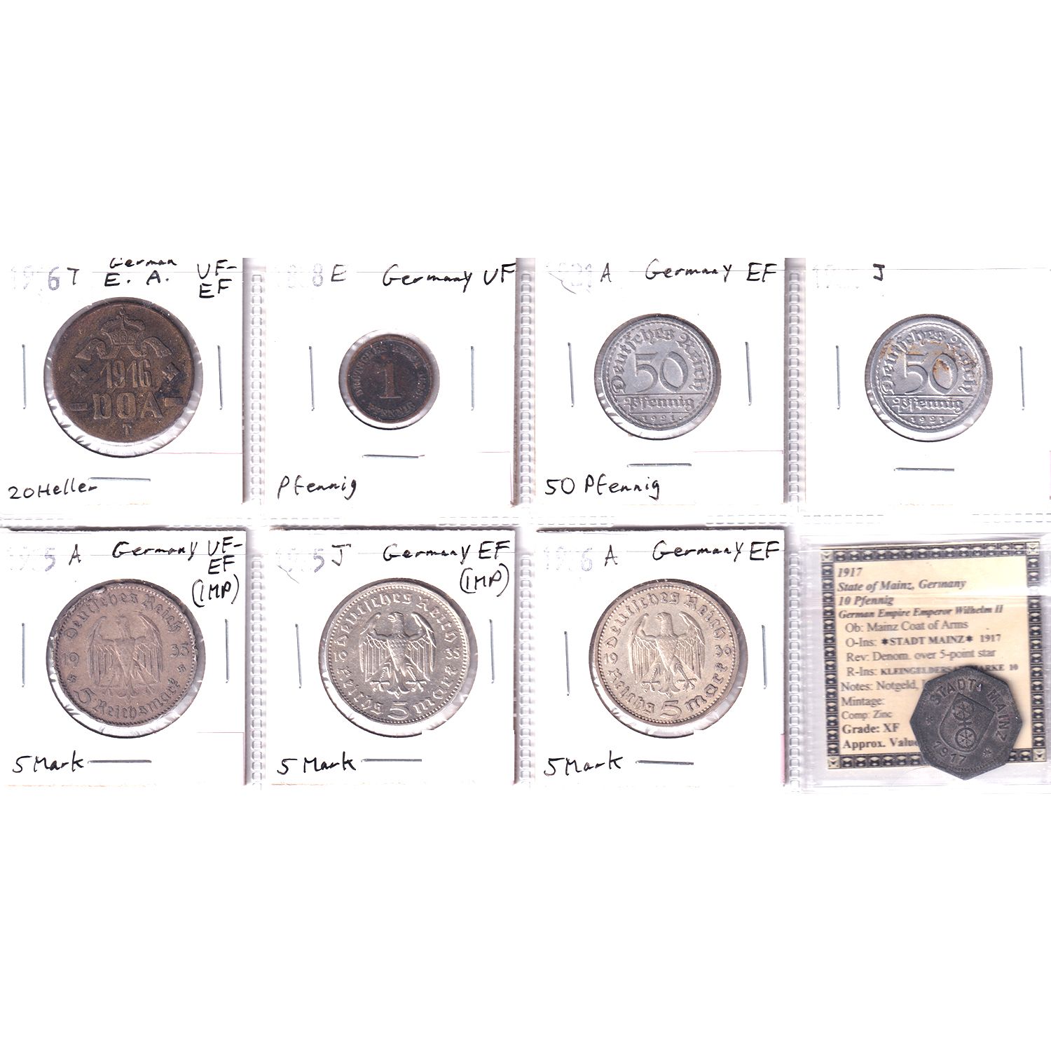 INCLUDES: 1916 20 Heller, 1921A 50 Pfennig, 1936A 5 Mark & More!! Sold as is; please view images for details. 8pcs.