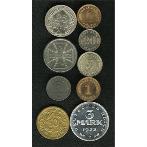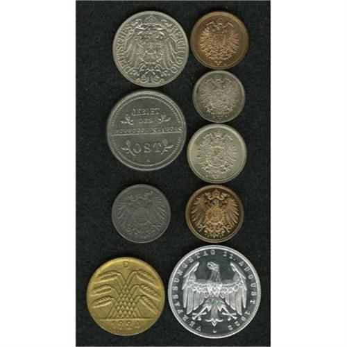 <B>Mixed lot of very choice minors:</B></I> 1876-A Pfennig, Choice BU; 1876-J 20 Pf, very choice; 1889-A 5 Pf, very choice; 1907-F Pf, lightly impaired Proof; 1910-A 25 Pf, choice; 1916-A 2 Kopeks, very choice; 1917-E 5 Pf, dark but choice; 1922-E 3 Mk, Gem Proof; and 1924-D 50 Rentenpfennig, lightly toned Unc. -- all very pleasing coins! <B>Sold as is, no return.</B></I><BR><I>From the Robert Sayre Collection. </B></I><BR><BR><b>Shipping:</b> Coins & Currency (<a target="_blank" href="http://www.heritageauctions.com/common/shipping.php">view shipping information</a>)