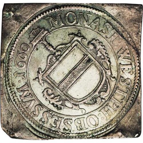 <B>Munster. AR klippe Taler 50 Sols 1660, </B></I> siege coinage issued during the siege of Munster by Bishop von Galen, KM323, Peus-50, VF-XF with minor edge flaws.<BR><BR><b>Shipping:</b> Coins & Currency (<a target="_blank" href="http://www.heritageauctions.com/common/shipping.php">view shipping information</a>)