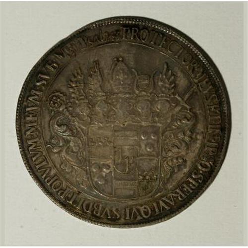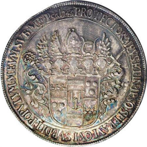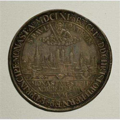 <B>Munster. Christof Bernhard Broad Taler 1661,</B></I> St. Paul in clouds over city view/Helmeted arms, KM75, Dav-5603, Choice XF. Lustrous, with attractive gray, blue, and gold toning.<BR><BR><b>Shipping:</b> Coins & Currency (<a target="_blank" href="http://www.heritageauctions.com/common/shipping.php">view shipping information</a>)
