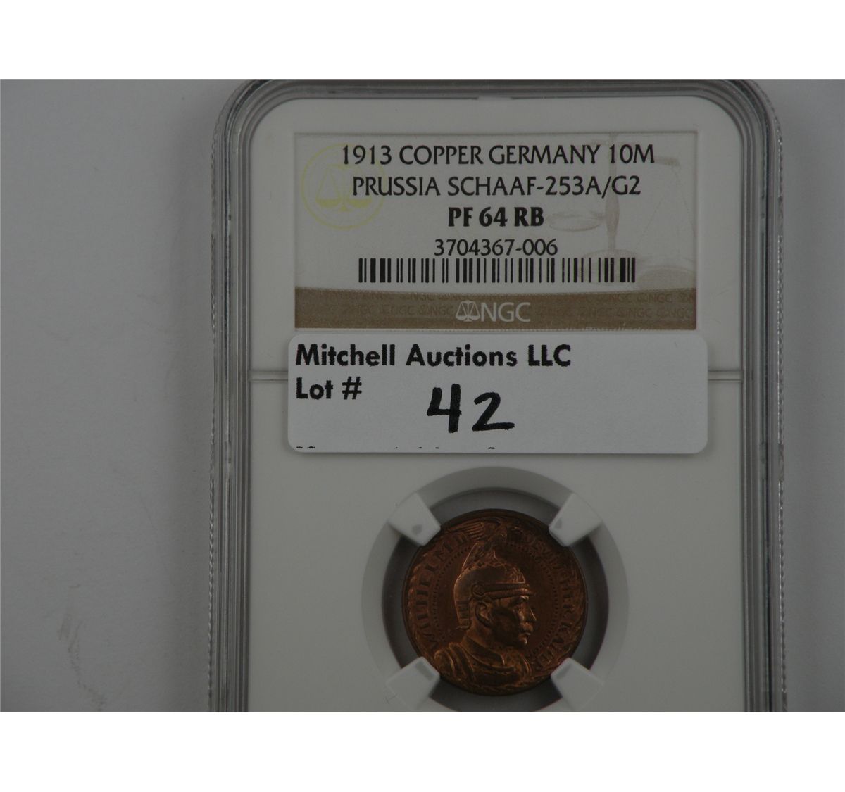 Germany, Prussia. 1913 10Mark pattern struck in copper. Schaaf 253A/G2. NGC PF64RB. Here is a bold, reflective example that features gently faded mint color. Est.$200