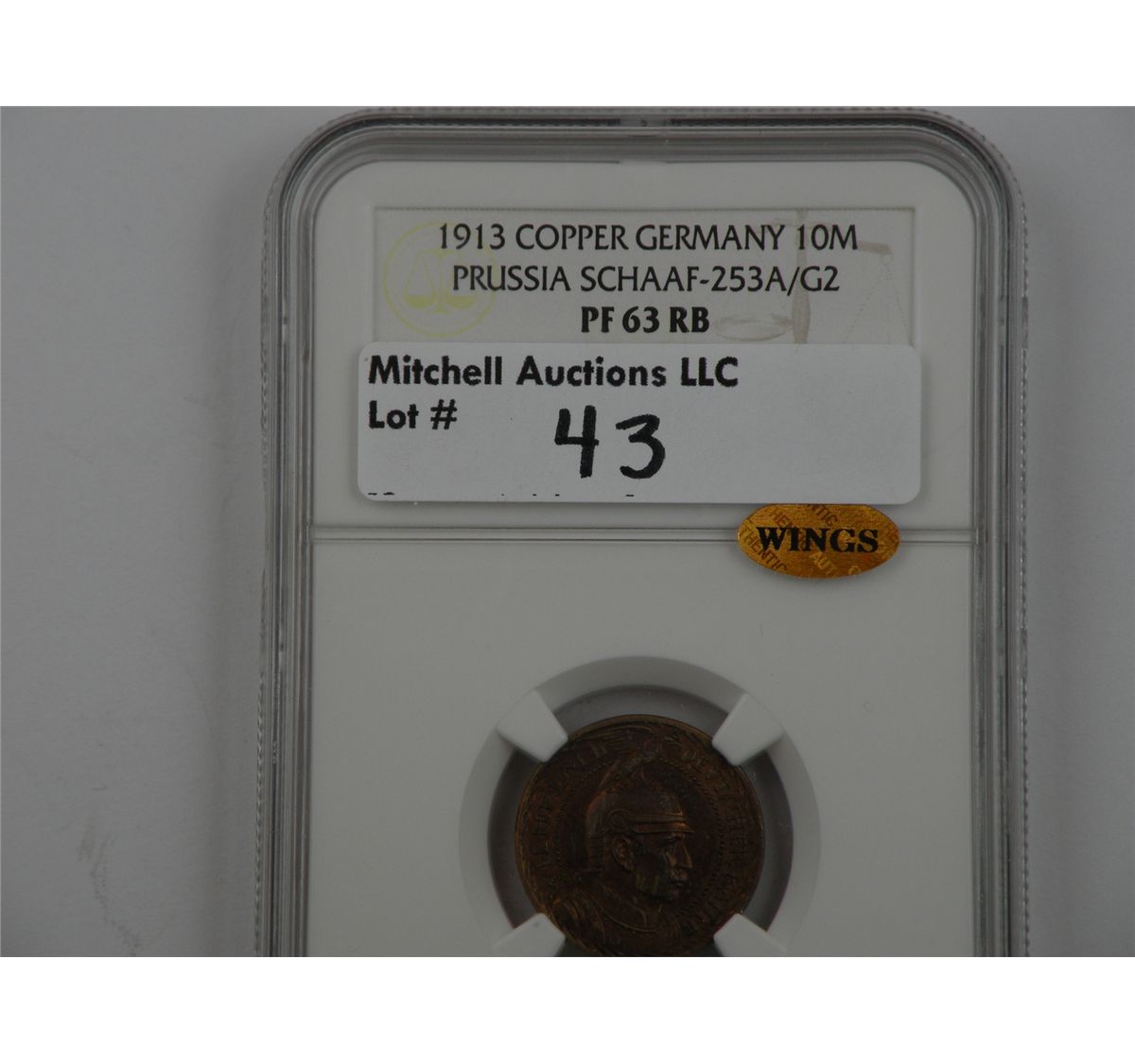 Germany, Prussia. 1913 10Mark pattern struck in copper. Schaaf 253A/G2. NGC PF63RB, wings approved. There is some minor unevenness in the reverse coloration, otherwise this red and brown example is easily a near Gem. Est.$200