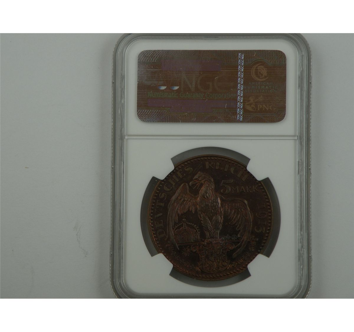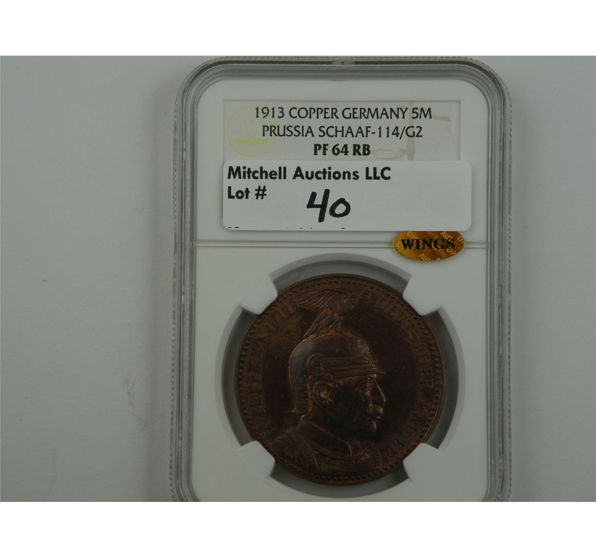 Germany, Prussia. 1913 5Mark pattern struck in copper. Schaaf-114/G2. NGC PF64RB, wings approved. Here is a mirrored red and brown example that reveals only light evidence of a fingerprint at the upper left obverse. Impressive nonetheless. Est.$225
