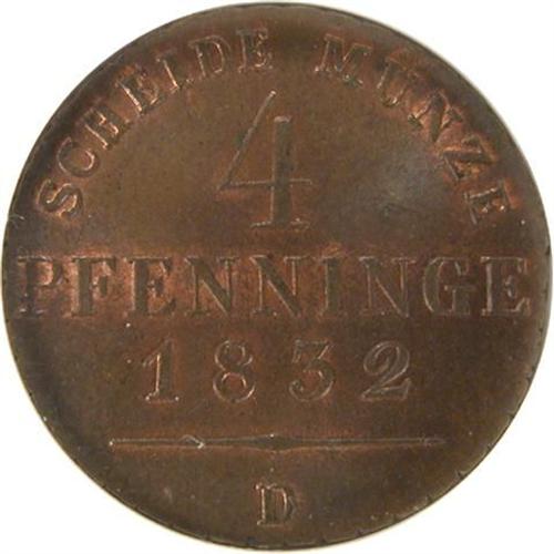 4 Pfenninge 1832D NGC MS-65 Red and Brown. A fully struck and strongly lustrous piece with attractive red accents in the legends and devices