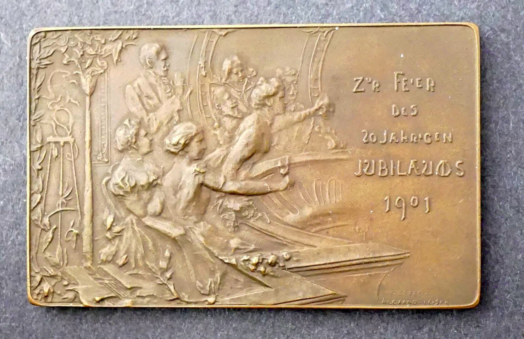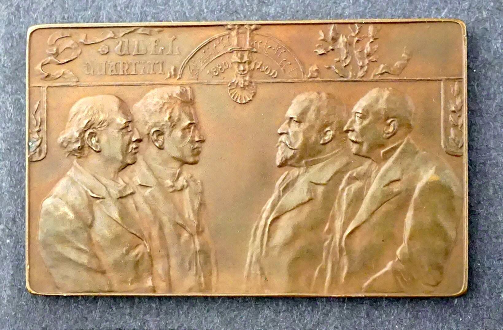 34 x 54 mm. 40.4 grams. Obverse has four gentlemen in half-figure, two facing two. Multiple figures on the reverse. An interesting piece, but frankly, the theme escapes us.