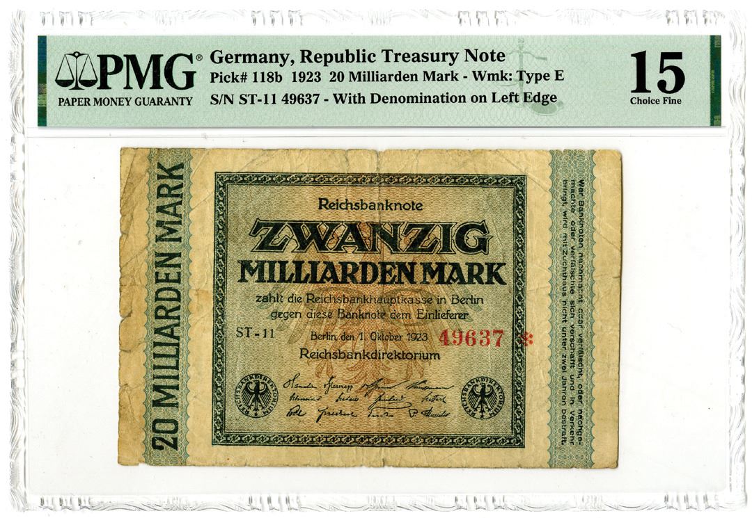 Germany. 1923. 5 Milliarden Mark, P-118b, Issued Republic Treasury Note, Dark green on blue and orange underprint, S/N ST-11 49637 - With Denomination on Left Edge instead of right, Watermark: Type E, PMG graded Choice Fine 15. Only 2 notes graded in the PMG census and none listed as having to gone to auction in Track and Price.