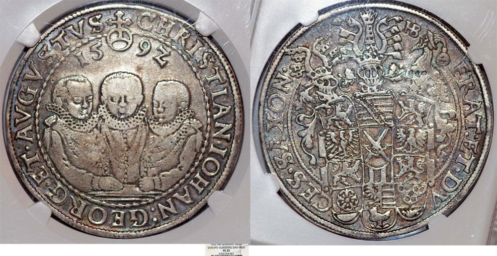 Rev: Triple helmeted coat of arms.