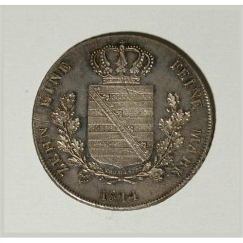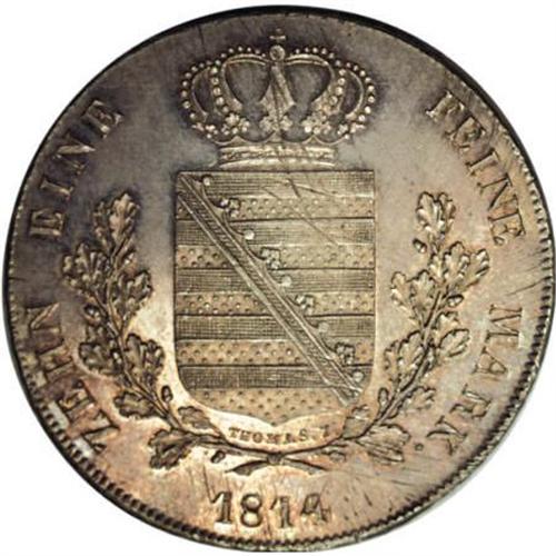 <B>Saxony. Friedrich August I Pattern Taler 1814,</B></I> KM-Pn67, prooflike AU with bluish-gray toning. Very rare and the first example we have seen of this elusive pattern.<BR><BR><b>Shipping:</b> Coins & Currency (<a target="_blank" href="http://www.heritageauctions.com/common/shipping.php">view shipping information</a>)