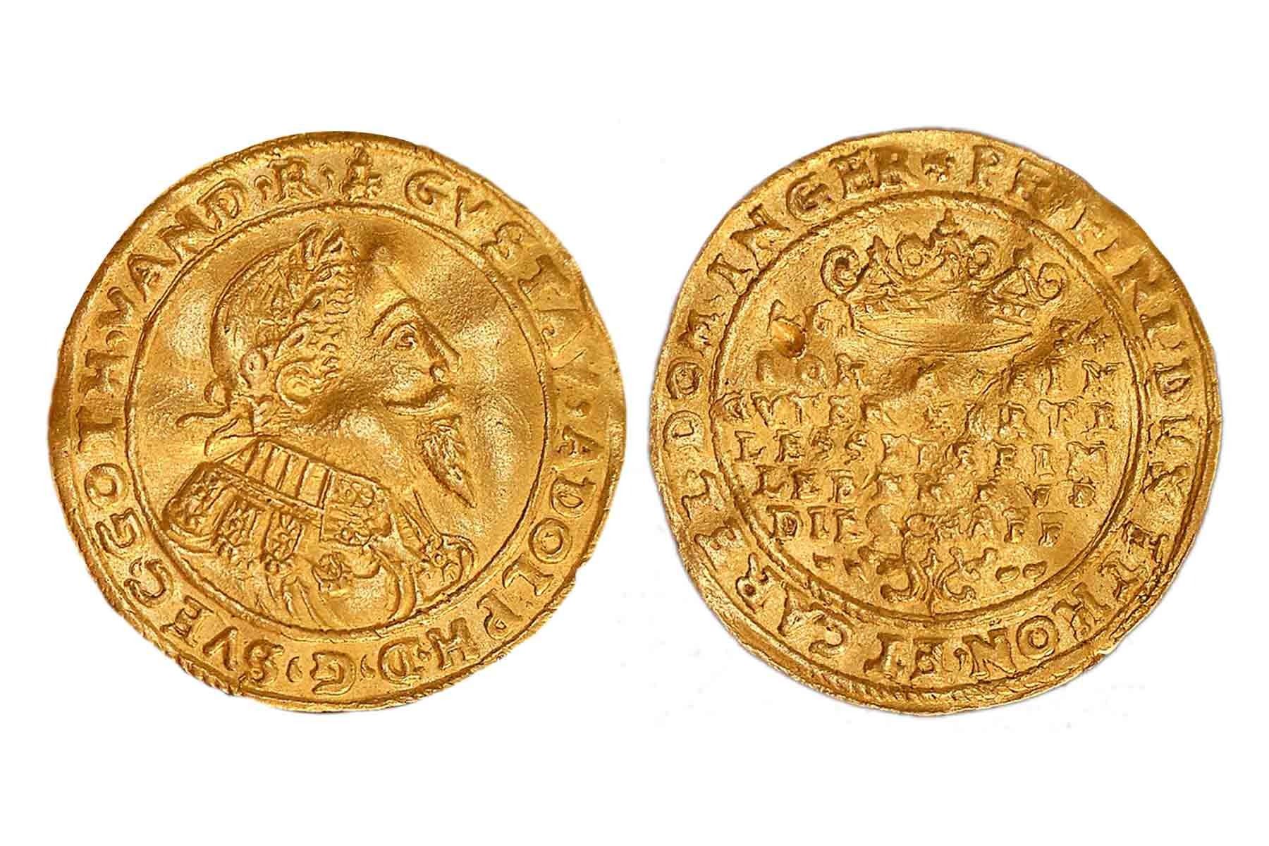 Germany State, Erfurt (Swedish Occupation), King Gustaf Adolphus, 1634, Gold Ducat, Erfurt Mint, 3.70 grams, .986 fine gold, Obv. Laureate, draped bust to right; Rev. Crown divides date, five-line inscription below, (KM 63, Hagander 108. Fr. 919.), Very Fine, Rare.
