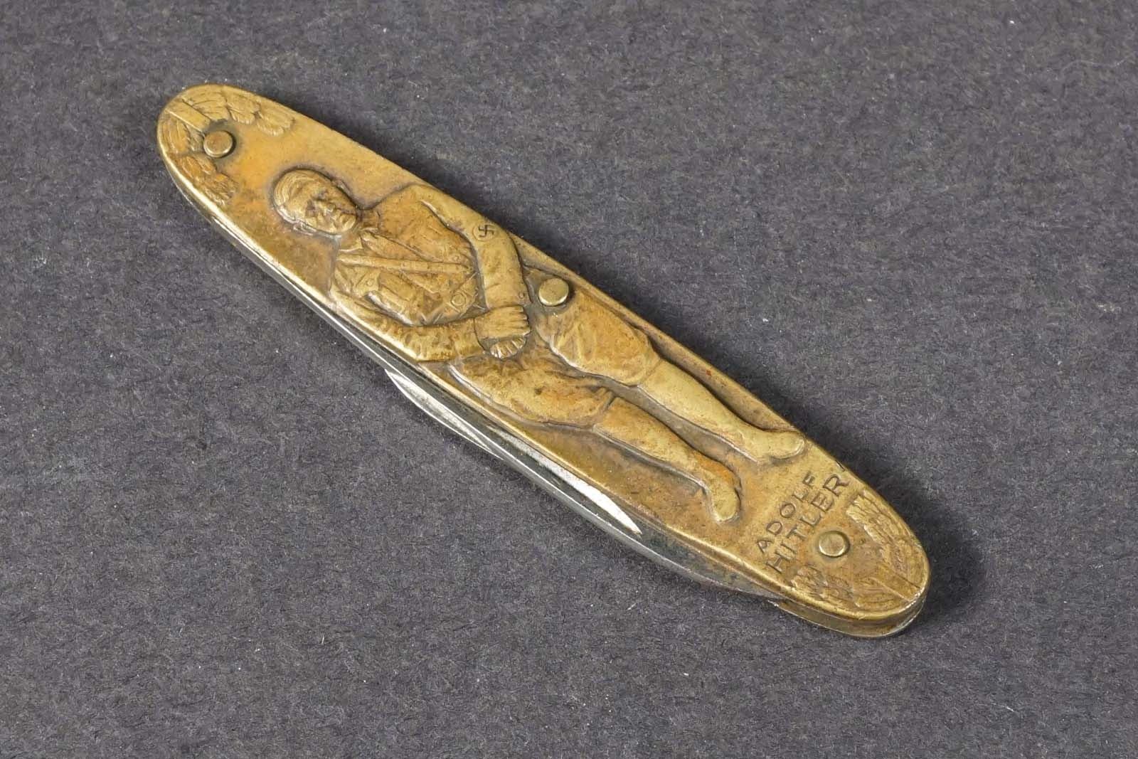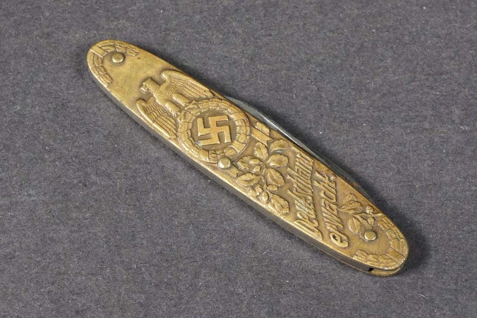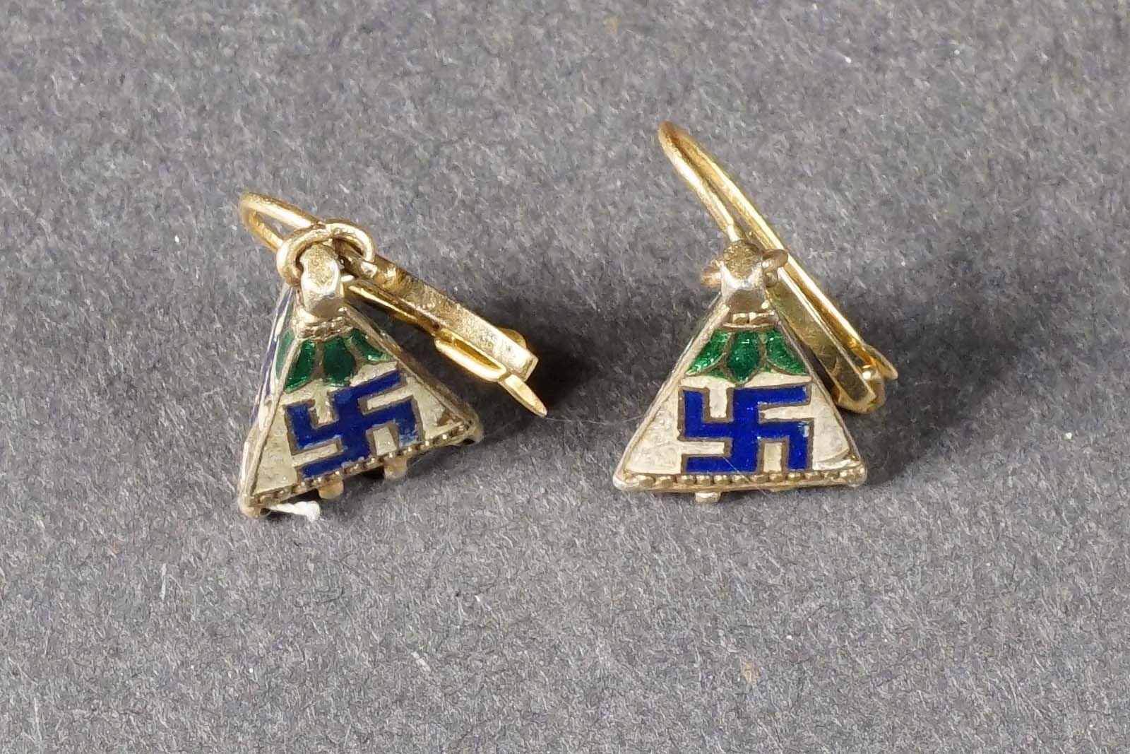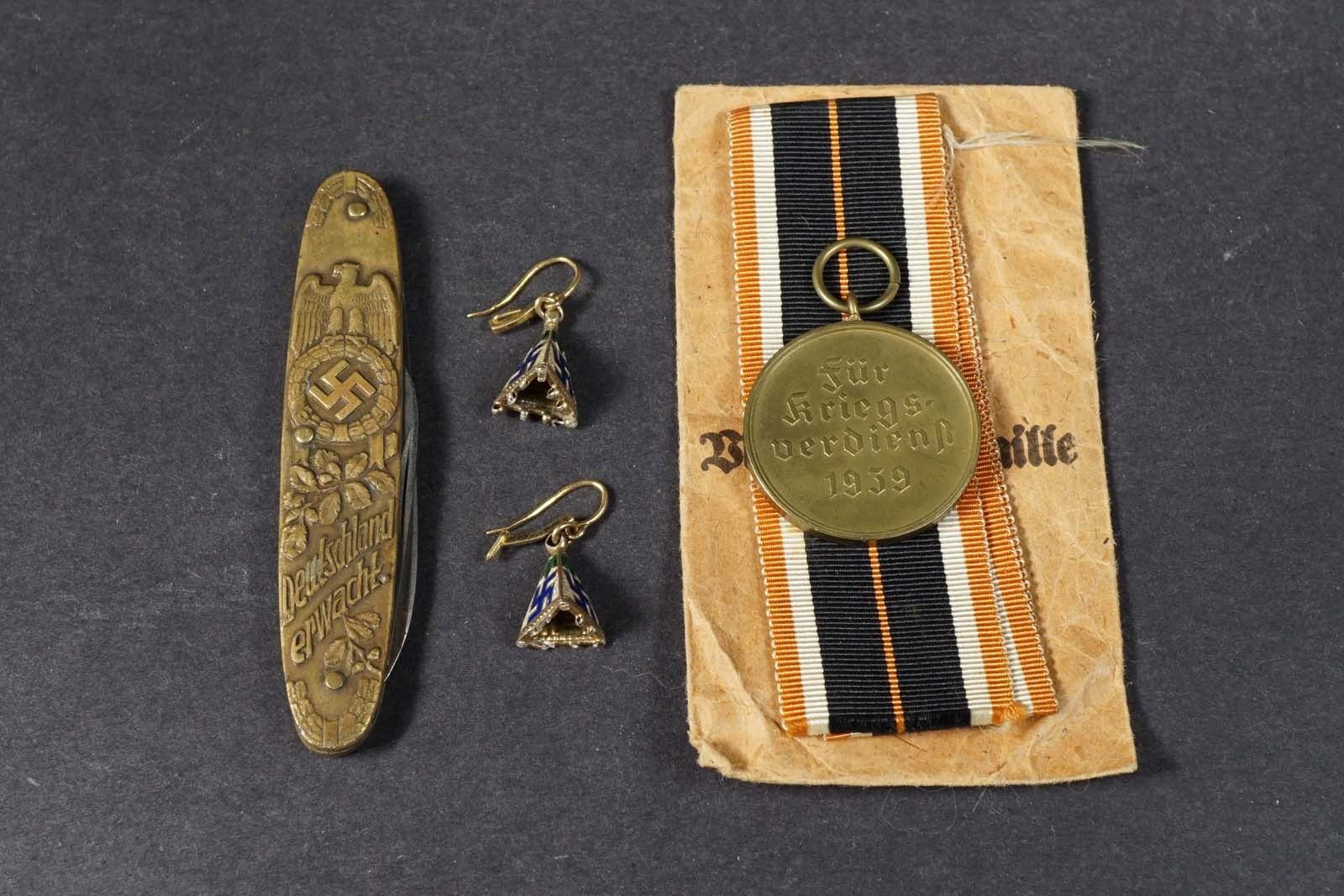1 - Brown Shirt Pocket Knife; 2 - War Merit Medal, with Ribbon and Original Wrapper; 3 - a pair of very finely made earrings in Vermeil, with Pyramidical shaped droppers,swastikas on all three sides, and coloured enamel.