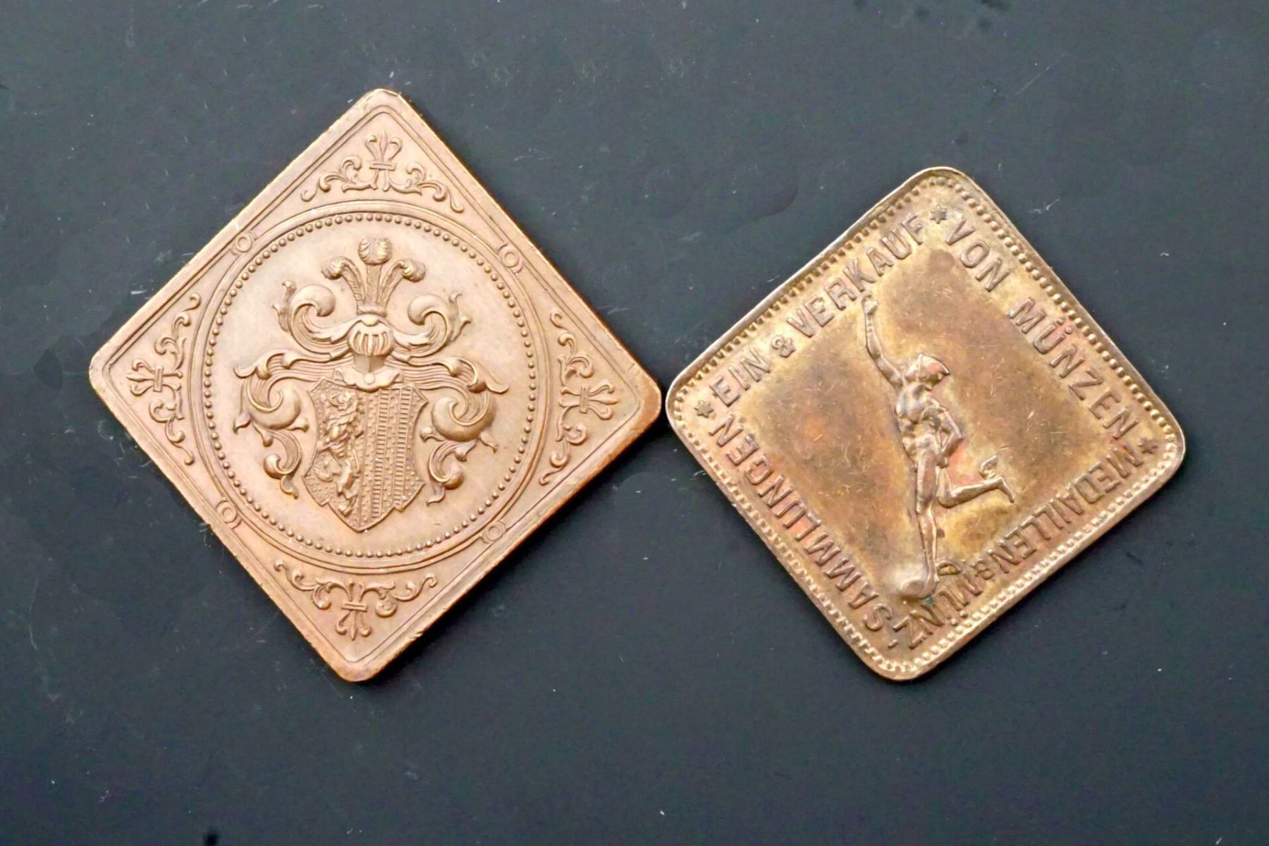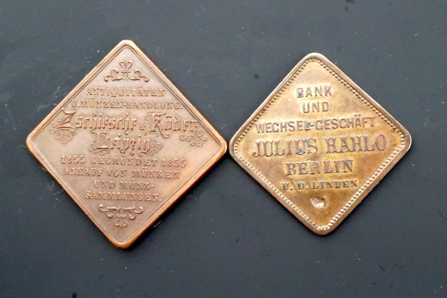 1) 27 mm square. Copper. From Leipzig. Seems to be dated from 1855. Beautiful condition. 2) From Berlin. Undated, Copper, 23 mm square, Hermes flying, hand outstretched. From shop of Julius Hahlo. punch at bottom. AU-UNC.