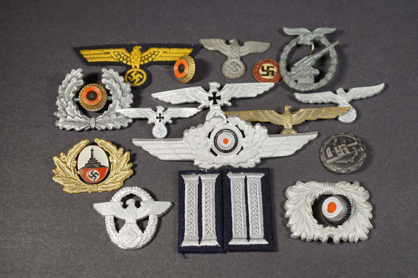 Army, Navy, Air Force, Police, interesting mix for dealer or collector. Note a Flakartillerie badge with the swastica removed, post-war. Total value of over 500$.