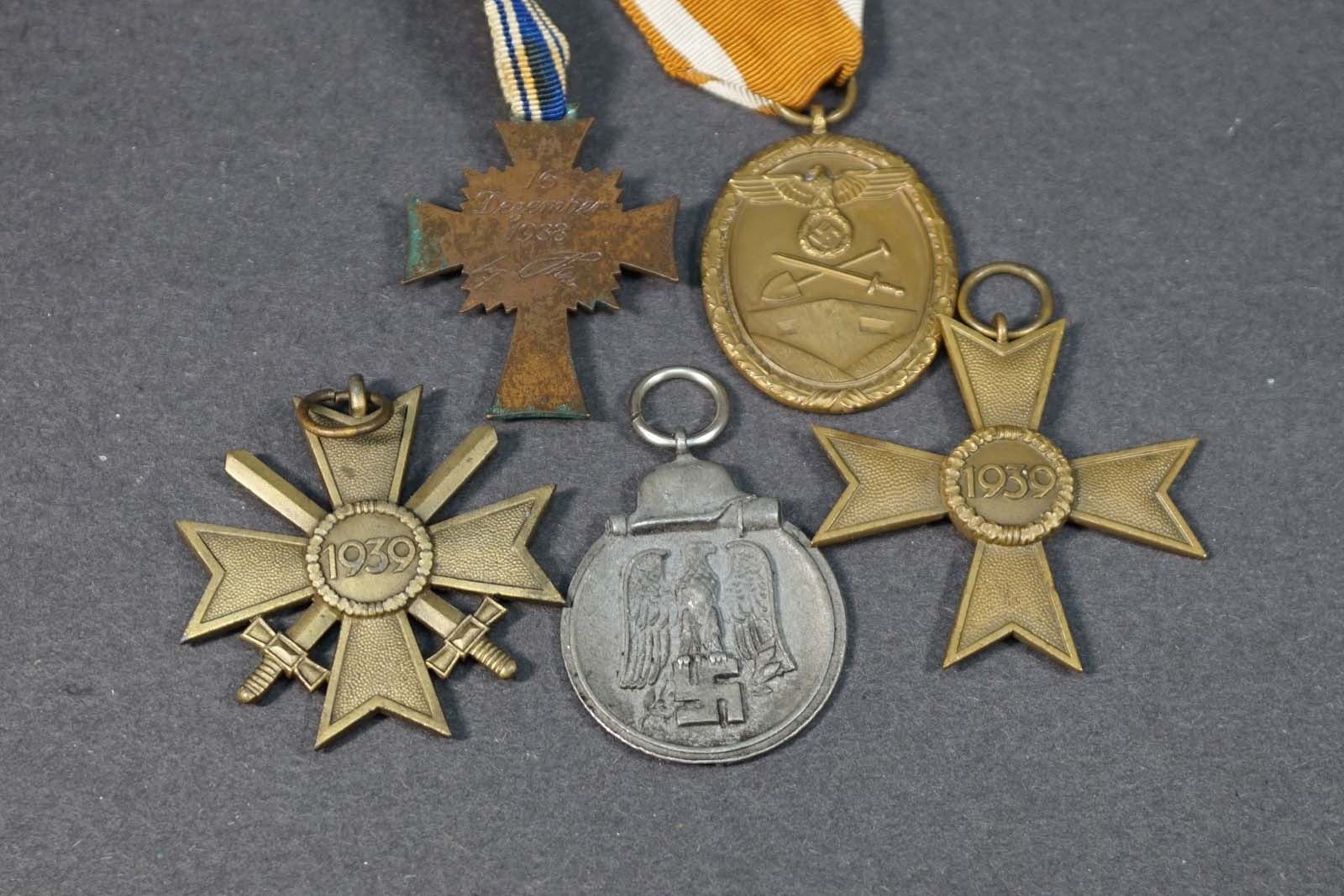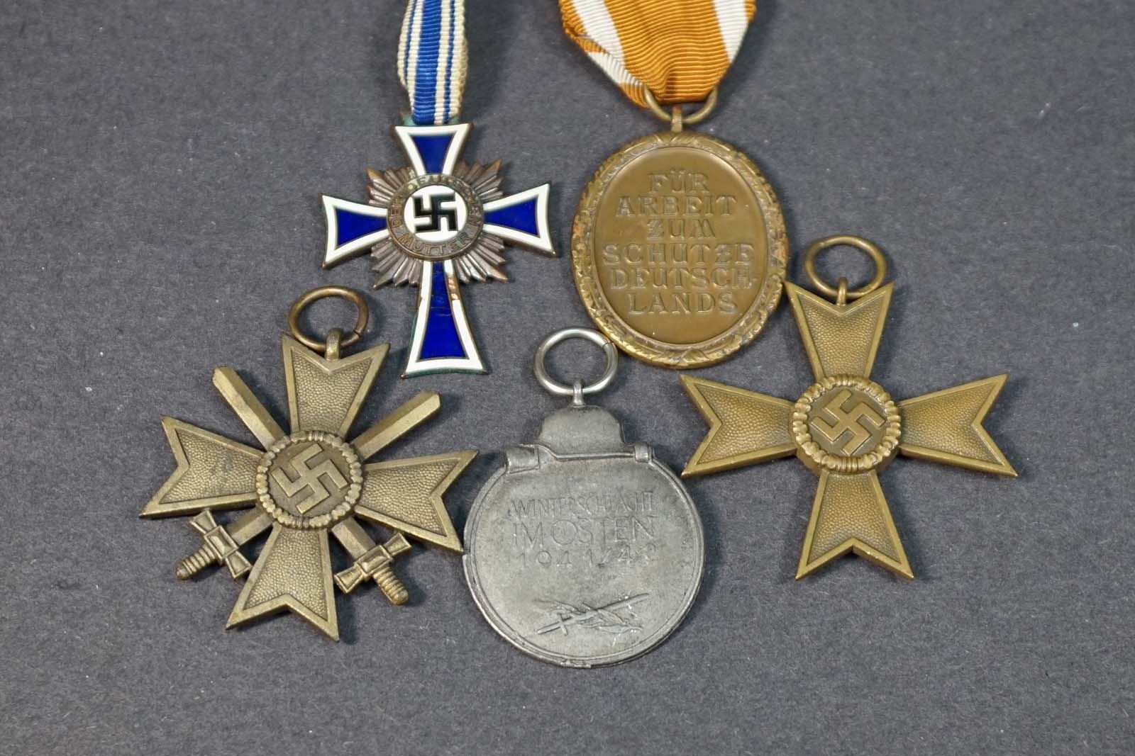 Two 2nd Class War Merit Crosses, one with, one without swords; Russian Front Medal, no ribbon; Mother's Cross Bronze, with Ribbon; West Wall Medal with Ribbon. Catalogue value : c. 200$