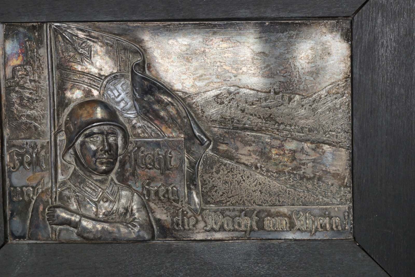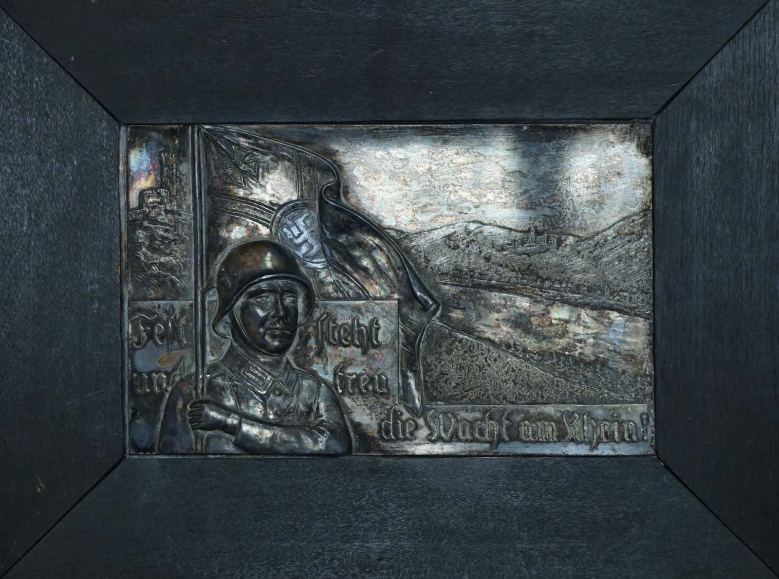 To left : Bust of uniformed soldier facing slightly right. Holding a pole with very large flag. To the right, the Rhine River showing its two banks. Across the bottom half, the first words of a patriotic song in gothic script, concerning the taking of the far bank. The plaque measures 17.5 x 26.6 cm and the wood frame measures 29 x 39 cm.