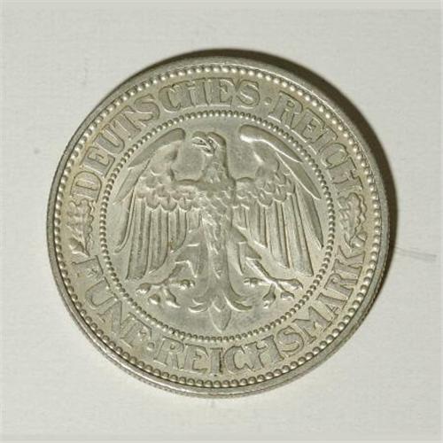 <B>Weimar Oak Tree 5 Mark 1930A,</B></I> KM56, nice lightly toned AU-UNC.<BR><BR><b>Shipping:</b> Coins & Currency (<a target="_blank" href="http://www.heritageauctions.com/common/shipping.php">view shipping information</a>)