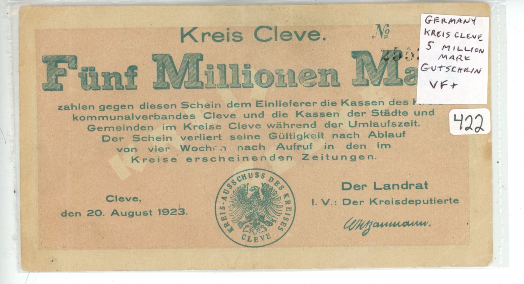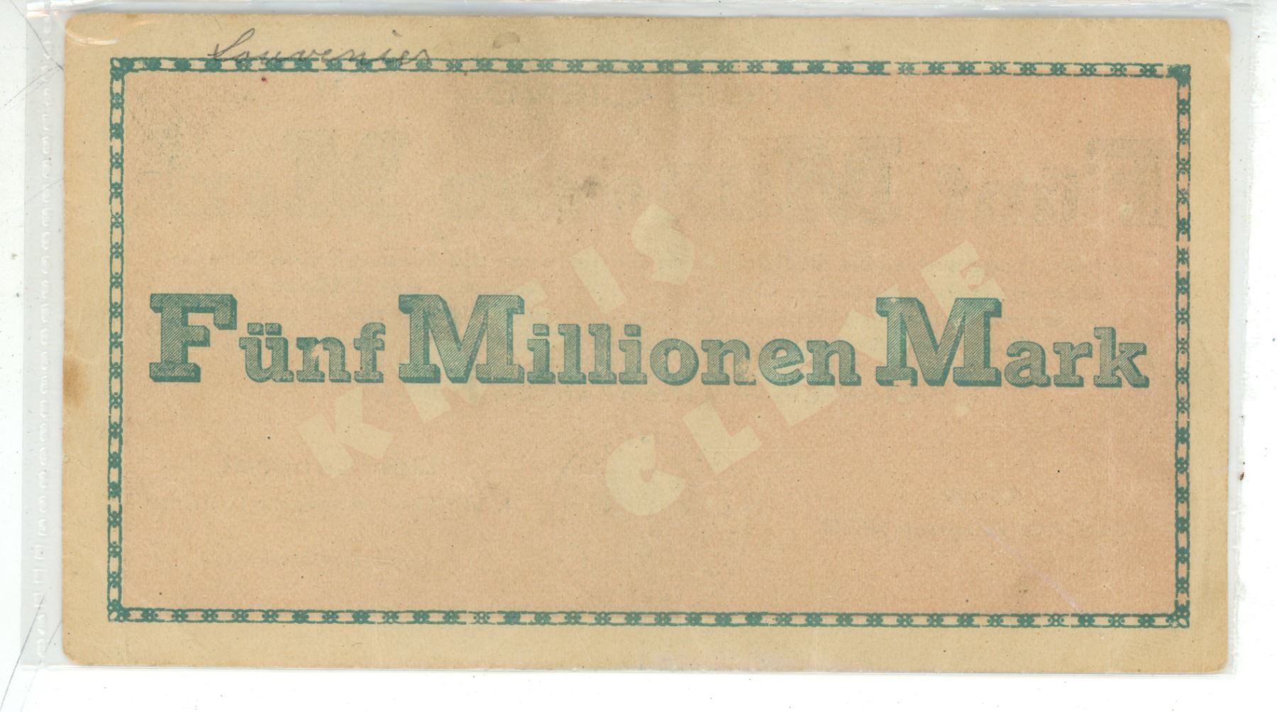 Germany – Weimar Republic. 1923 5 Million Mark Gutschein from Kreis Cleve. VF+.