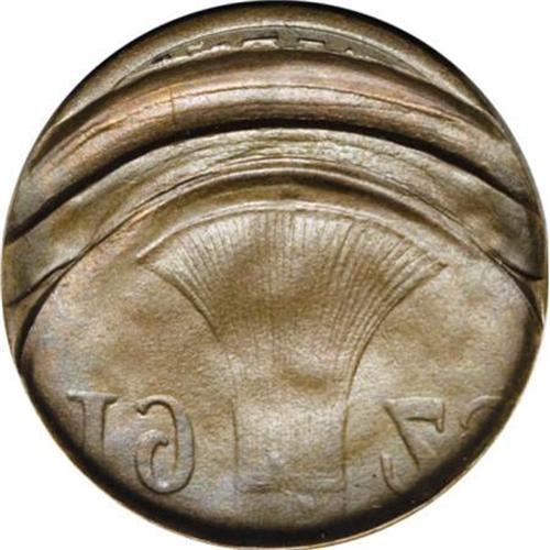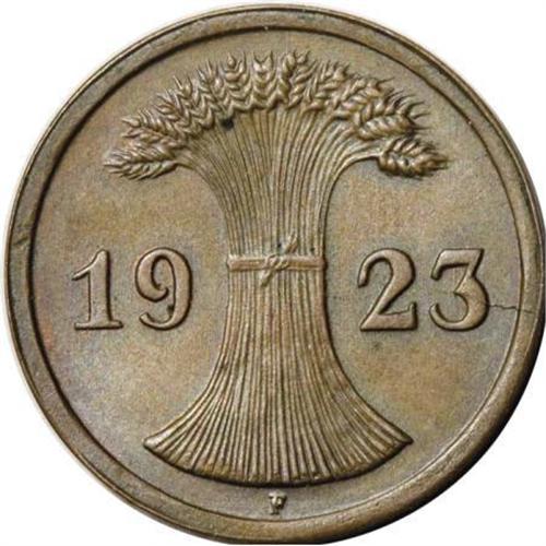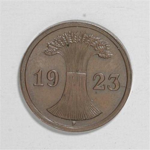 <B>Weimar Republic. 2 Pfennig 1923-F error:</B></I> reverse brockage with multiple strikes, KM-31, Choice Uncirculated, light brown surfaces showing a dramatic mis-struck "reflection" of the reverse on the side intended to be the obverse. Rare.<BR><BR><b>Shipping:</b> Coins & Currency (<a target="_blank" href="http://www.heritageauctions.com/common/shipping.php">view shipping information</a>)