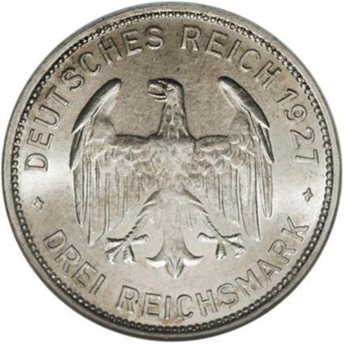 <B>Weimar Republic 3 Mark 1927F Tubingen, </B></I>KM54, MS65 NGC, full frosty white mint luster with light peripheral toning. Very scarce type in mint state.<BR><BR><b>Shipping:</b> Coins & Currency (<a target="_blank" href="http://www.heritageauctions.com/common/shipping.php">view shipping information</a>)